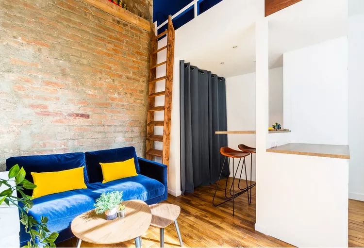 Neva Interior Design transformed this petite Parisian living room with a compact loveseat in a vibrant jewel tone, infusing the space with a touch of luxury. The rich color contrasts beautifully with the warm hardwood floors and the original brick feature wall, creating a dynamic yet harmonious atmosphere. This clever use of color not only enhances the room’s sense of grandeur but also elevates the overall aesthetic, making the small space feel both stylish and expansive.