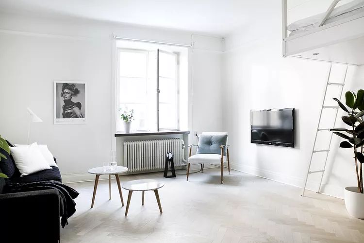 When designing a small apartment living room, the key is often to minimize excess furniture. A loft bed is a smart solution, creating a more open and airy feel while also freeing up floor space for other essential furniture. The Scandinavian-inspired design in this example uses simple, minimal pieces with a neutral color palette and abundant natural light. The loft bed seamlessly blends into the surroundings, keeping the space feeling light and spacious.