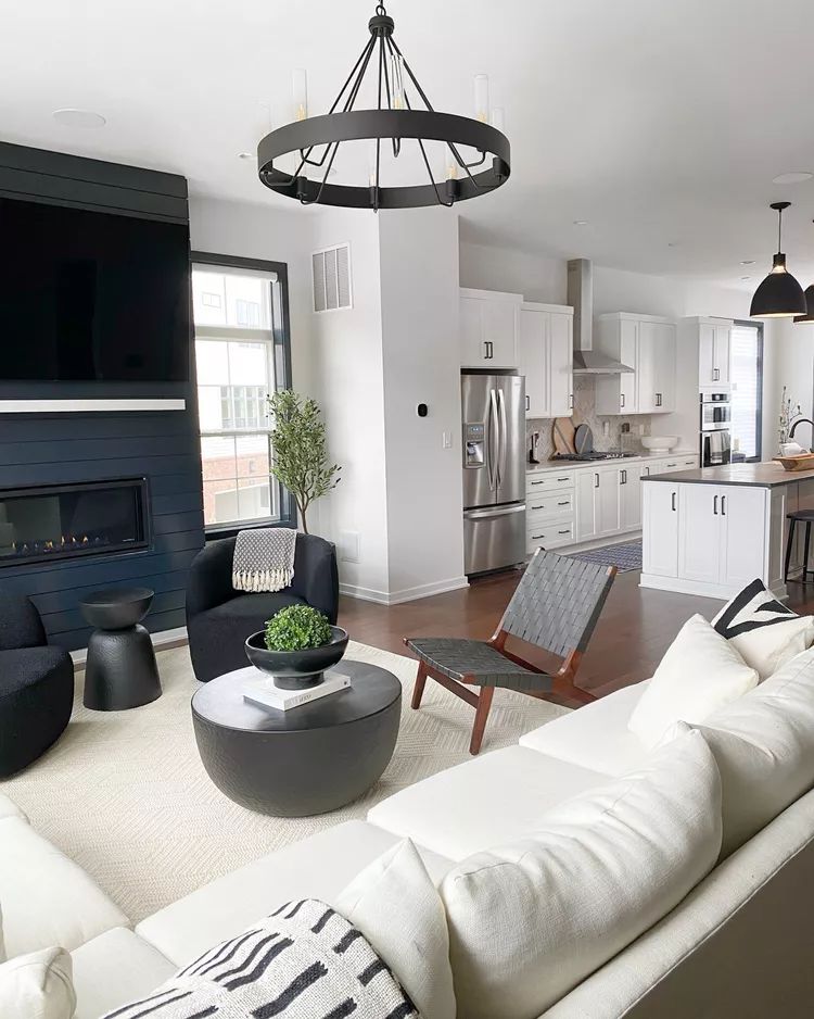 A striking accent wall can effortlessly elevate your apartment living room, especially in open-plan spaces where defining zones is essential. Consider incorporating bold colors, like navy, to create a sense of depth and separation. In this living room, the deep navy hue on the fireplace wall draws attention while also camouflaging the TV, making the seating area feel more anchored. It’s a great way to refresh the space and add personality without overwhelming it.