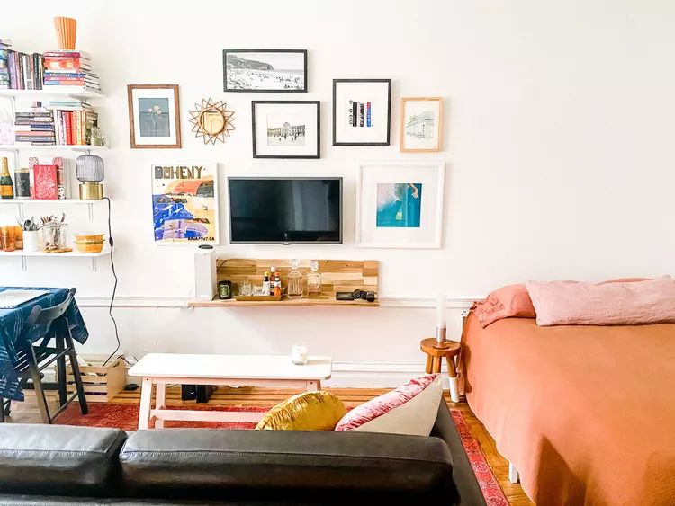 In this Brooklyn studio, wall space is optimized with a gallery wall that cleverly hides the TV, making it less of a focal point. Above the dining table, simple wall shelves offer functional storage, perfect for displaying books, lighting, and tableware. This setup works particularly well in open-plan spaces, providing both decorative and practical solutions while keeping the area feeling organized and spacious.