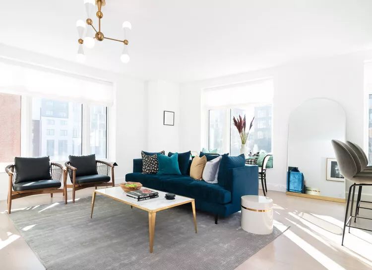 For a budget-friendly yet stylish apartment living room, focus on investing in one standout feature that can elevate the space. In this NYC apartment, an industrial double wall sconce is the signature piece that adds character. Pairing affordable furniture with bold lighting or a unique design element can transform the space, proving you don’t have to splurge on every item to make an impactful statement. Consider quality accent pieces that can move with you to future homes.