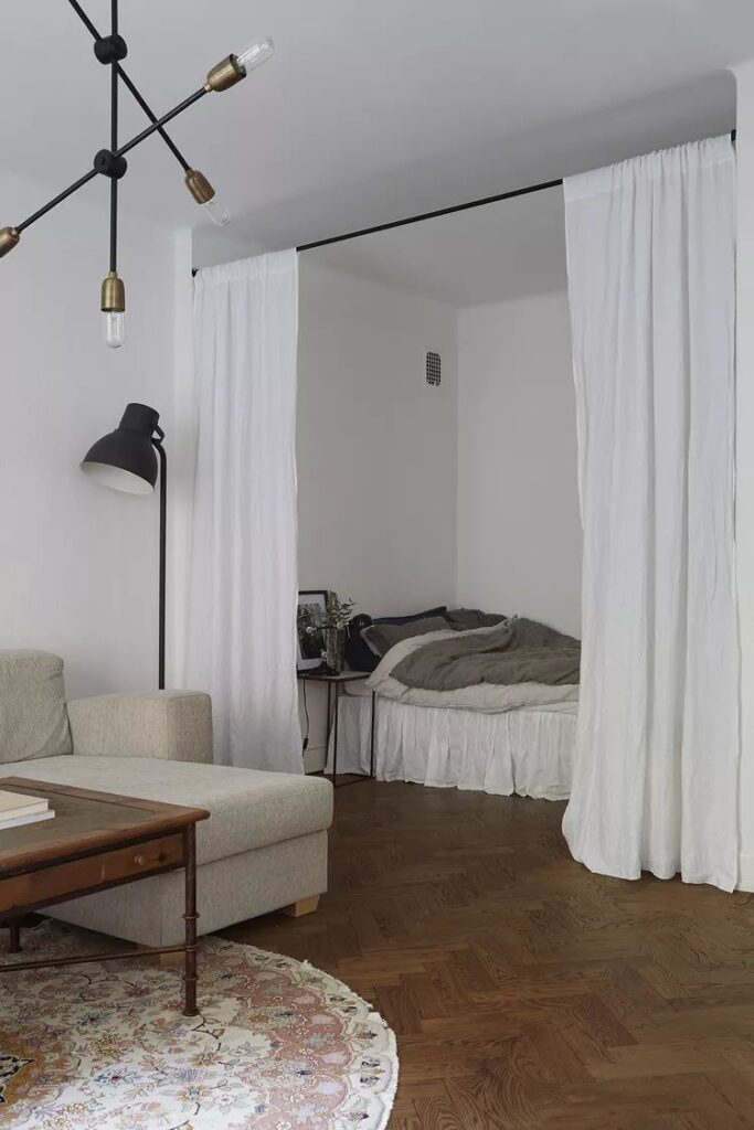 For a quick, budget-friendly solution in a studio apartment, hang lightweight curtains to separate the bed from the living area. This simple trick creates the feeling of a private bedroom while still allowing the space to remain open and airy. Easily draw the curtains shut when you want privacy or to hide the bed from guests. It’s an easy way to optimize your space without the need for costly walls or partitions.