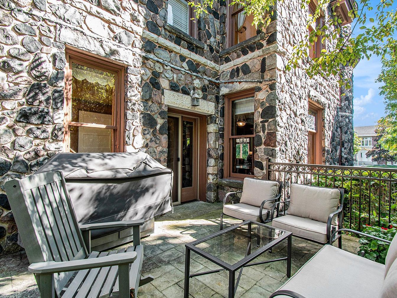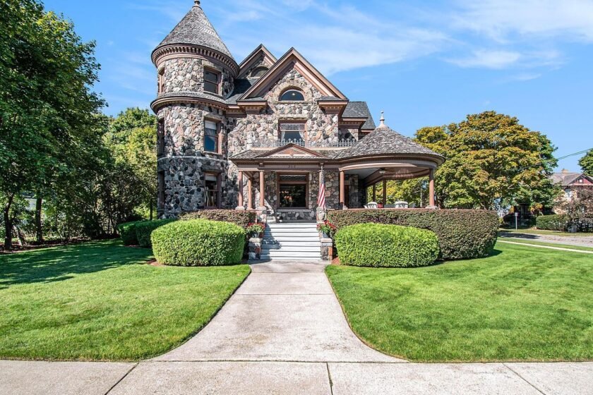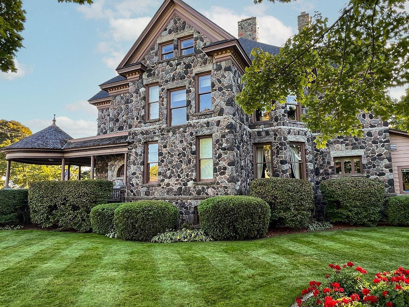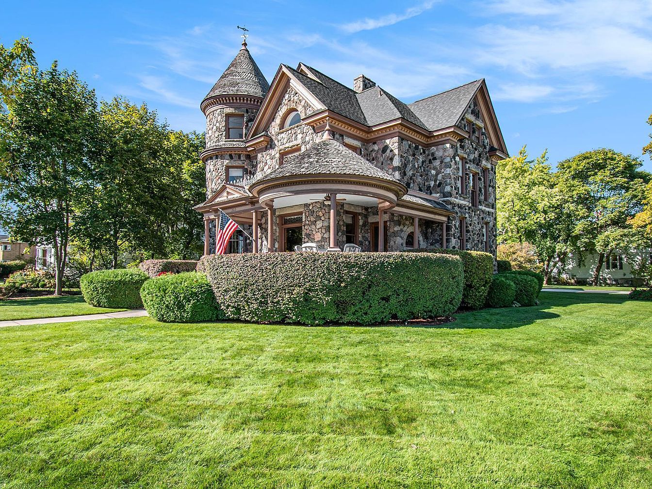 This striking Victorian residence blends architectural charm with modern aesthetics, featuring a stone façade and intricate gables. A round turret adds a whimsical touch, while a porch with classic rocking chairs invites lounging and socializing. Verdant landscaping enhances curb appeal and creates a family-friendly atmosphere. The manicured lawn and mature trees frame the home, and an American flag signals a sense of community and heritage.
