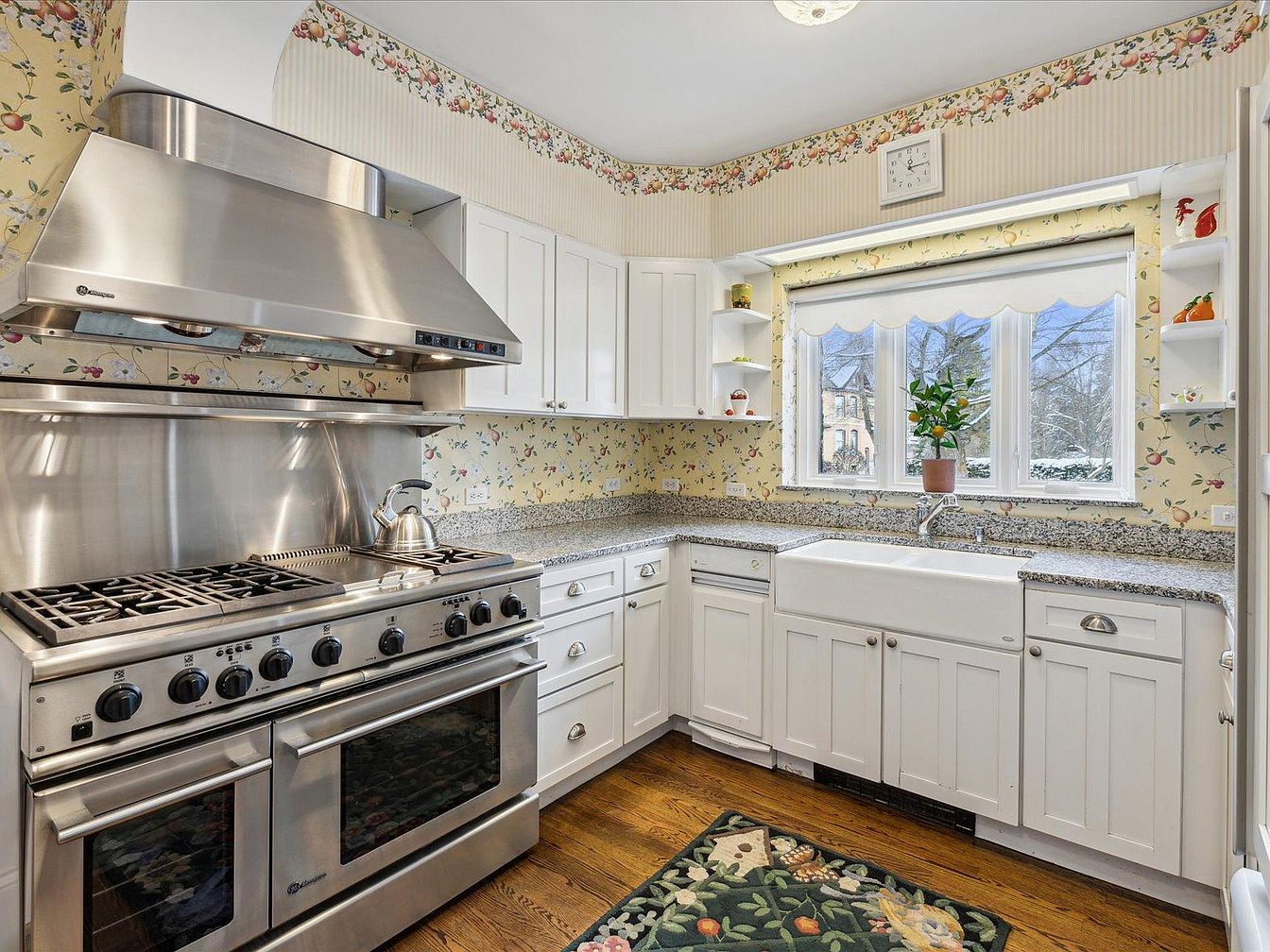 This kitchen blends timeless charm with contemporary practicality. A generous stainless steel range sits between pristine white cabinetry and granite countertops, forming an efficient culinary area. Floral wallpaper adds warmth, while a large window floods the room with light, framed by a scalloped valance. Open shelves display charming decor, and a farmhouse sink serves as a striking centerpiece. The layout suits both cooking enthusiasts and lively family gatherings.