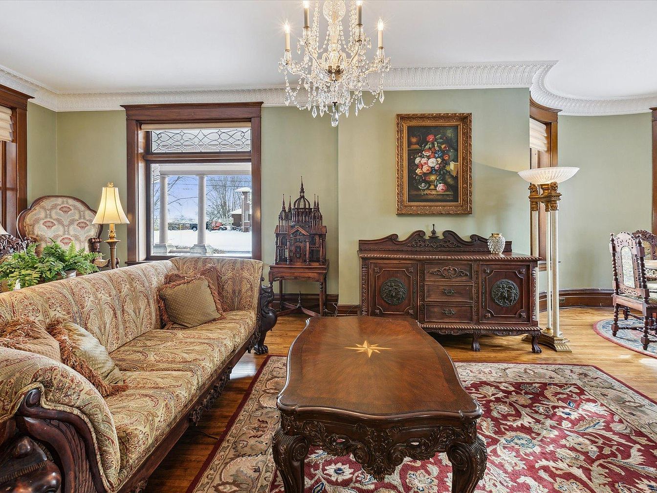 The living room exudes warmth and sophistication, combining rich wood details with plush furnishings. A patterned sofa with embroidered accents and soft throws invites relaxation. A wooden coffee table featuring a star inlay complements a carved sideboard. Natural light streams through large windows, highlighting pale green walls and crown molding. A chandelier and tasteful artwork complete the look, making it ideal for family time or quiet evenings.