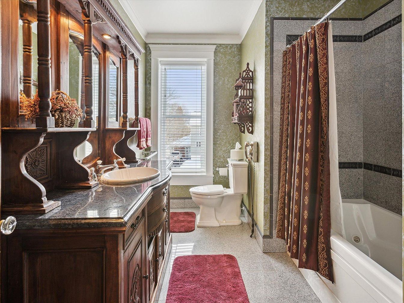 A vintage-inspired bathroom with a dark wood vanity and granite countertop. Soft lighting highlights the warm tones, and an olive green wall offers a calming backdrop. Details include coordinated red and gold accents and a textured curtain. A generous window bathes the room in natural light, maintaining a bright, welcoming space for family use and personal retreats.
