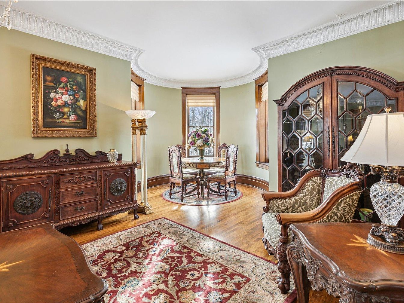 The dining nook offers a graceful curved layout that fosters an inviting atmosphere. Rich wood accents and detailed trim pair with soft green walls and warm floors. A round dining table is surrounded by ornate vintage chairs, ideal for family gatherings. An exquisite chandelier reflects off the crystal lamp, elevating the cozy mood, while a floral artwork provides a colorful focal point. A decorative sideboard and an area rug add warmth and character for intimate meals.