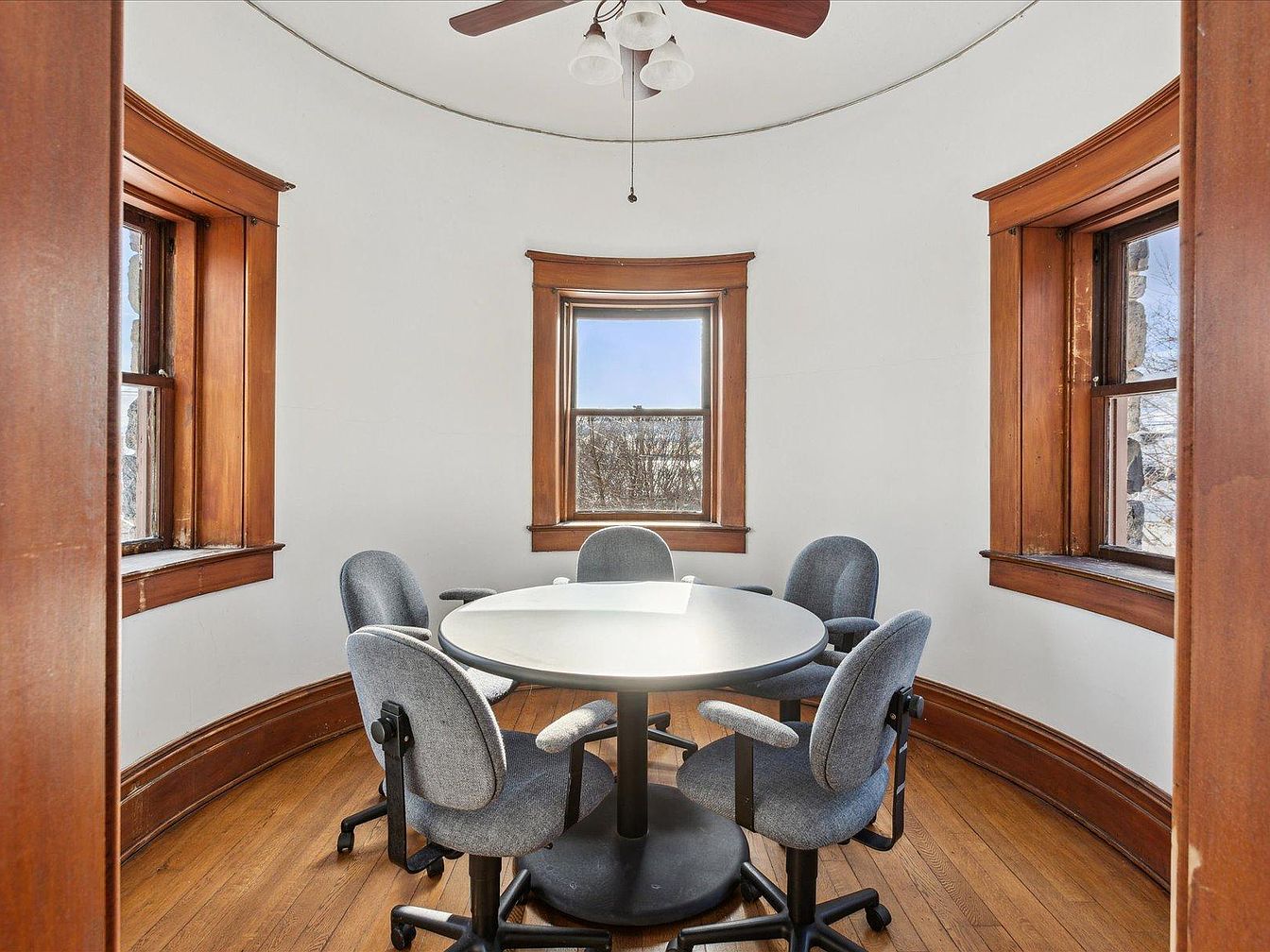 The dining nook provides a comfortable setting for family time, featuring a round table and gray ergonomic chairs. Natural light filters through wooden windows, while rounded walls create a cozy vibe. A polished hardwood floor pairs with rich wood trim, and an overhead ceiling fan ensures year-round comfort, making it a charming space for meals and conversation.