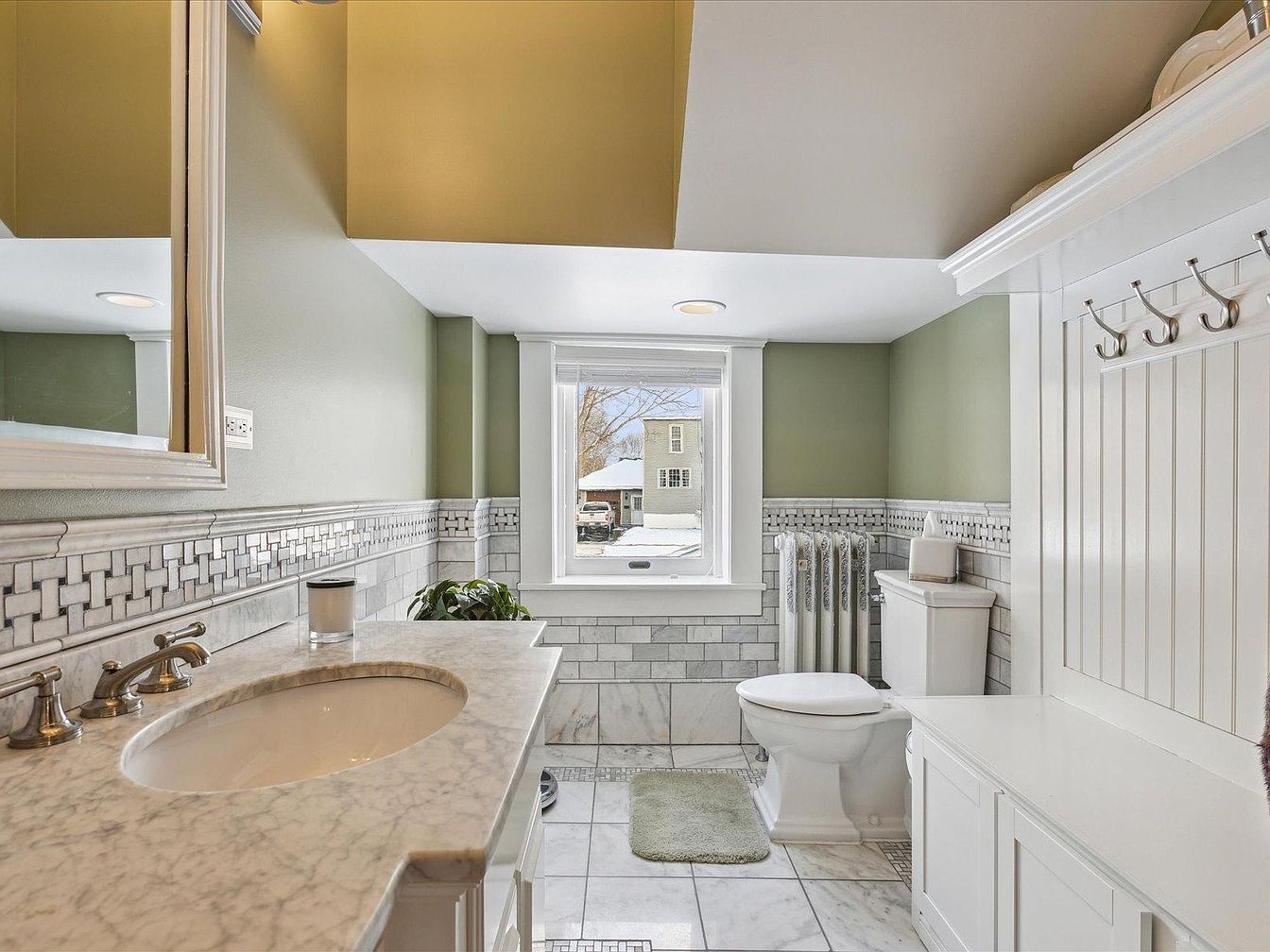 A contemporary bathroom that blends elegance with practicality, featuring a marble countertop paired with polished chrome fixtures for a sleek finish. Green walls foster a calming mood, and decorative tile borders add sophistication. A large window fills the space with light, while a built-in storage bench and hooks provide family-friendly convenience. A white vanity and tiled flooring complete the stylish, functional design.