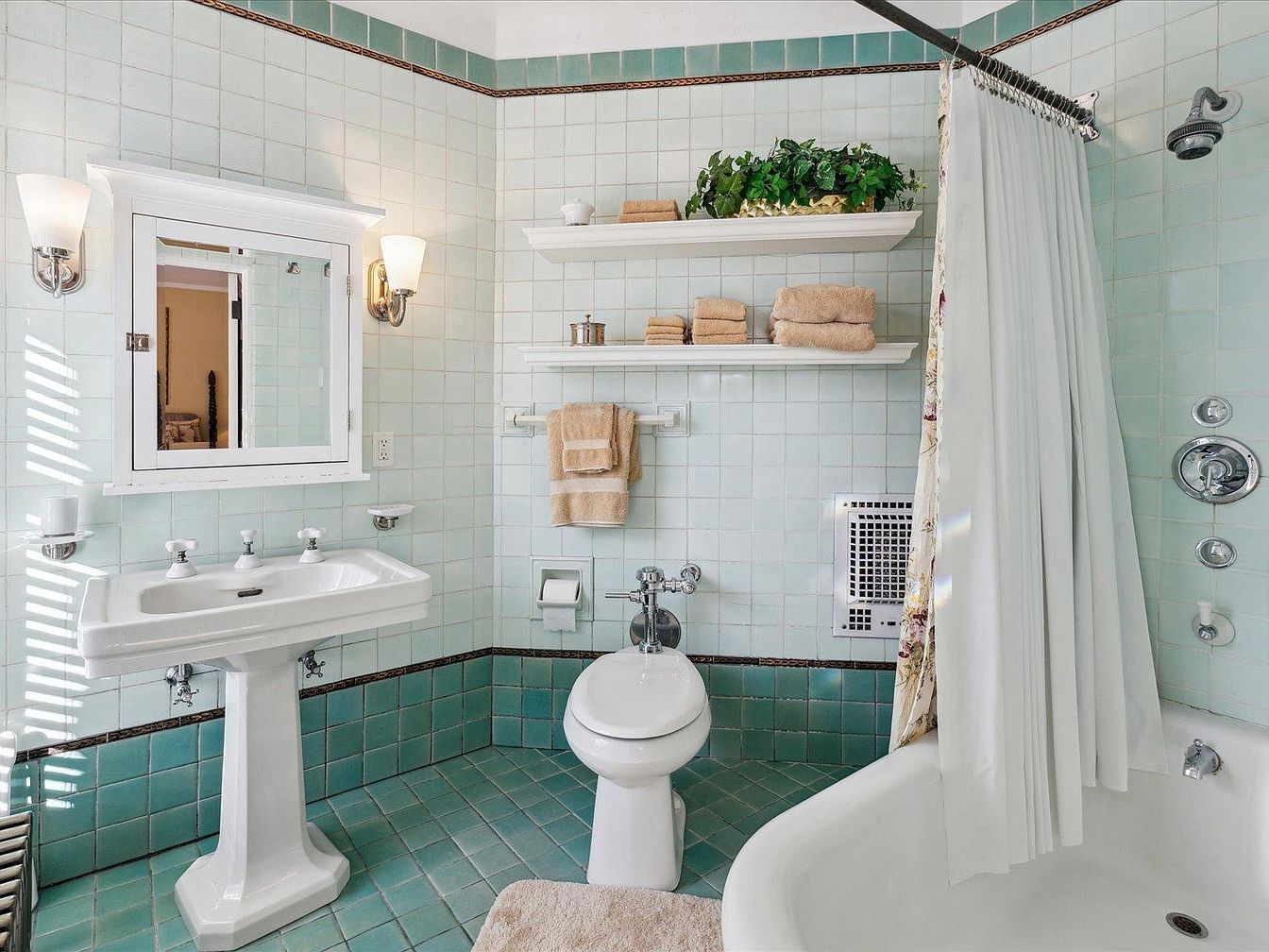 A tasteful fusion of vintage charm and modern comfort, featuring aqua tiles and dark teal accents. A pedestal sink serves as an elegant focal point, with ample shelving for towels and decor plants. Sconces provide warm lighting, and a combined bathtub and shower area with a floral curtain invites relaxation. The layout emphasizes accessibility and comfort for family living.