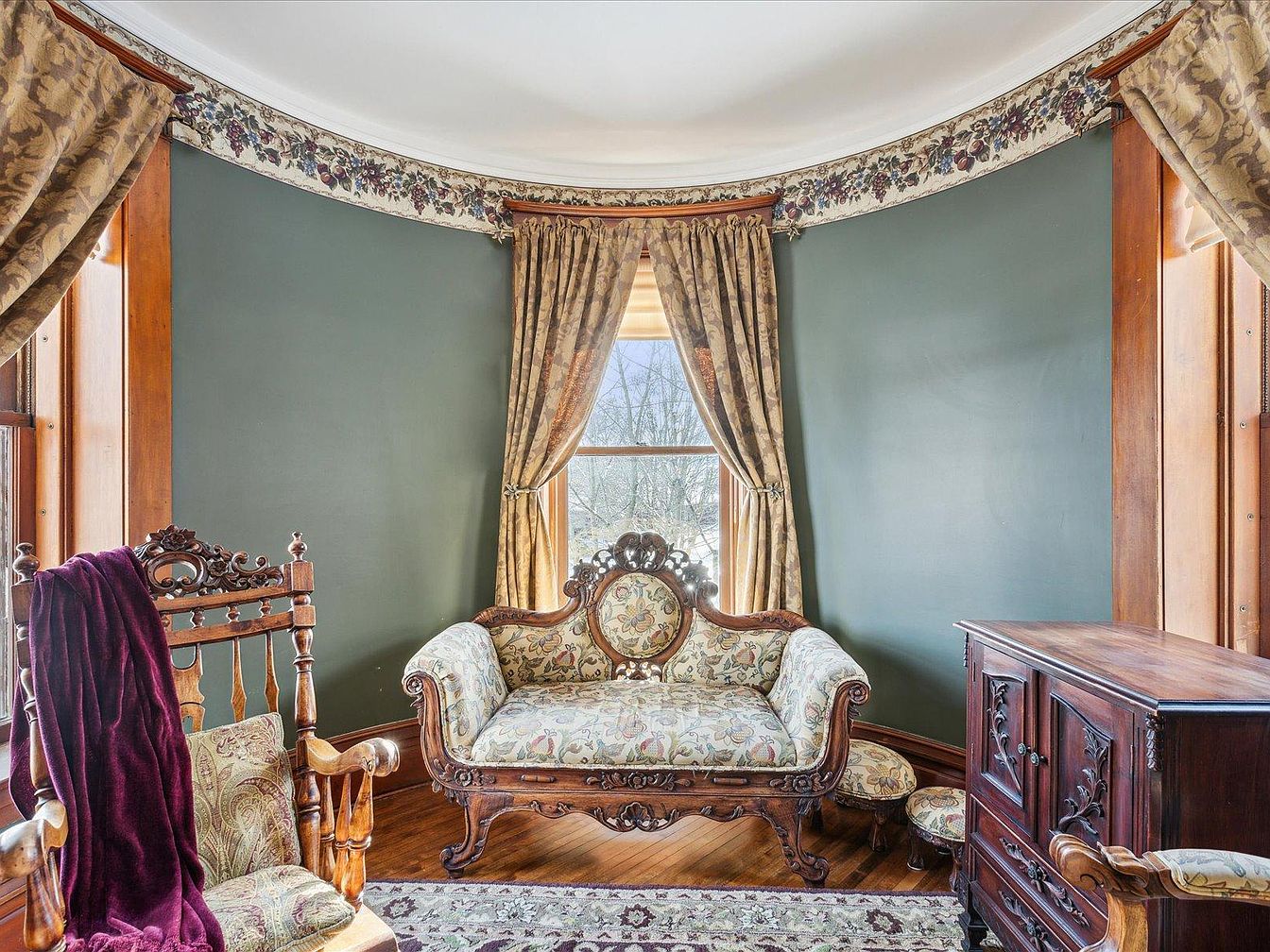 The Victorian sitting area showcases mahogany furniture and a vintage floral settee. Upholstered seating with carved arms and legs sits beside large windows with decorative drapery, letting light fall on a green wall. A knitted throw and additional seating create a welcoming space for family time and gatherings.