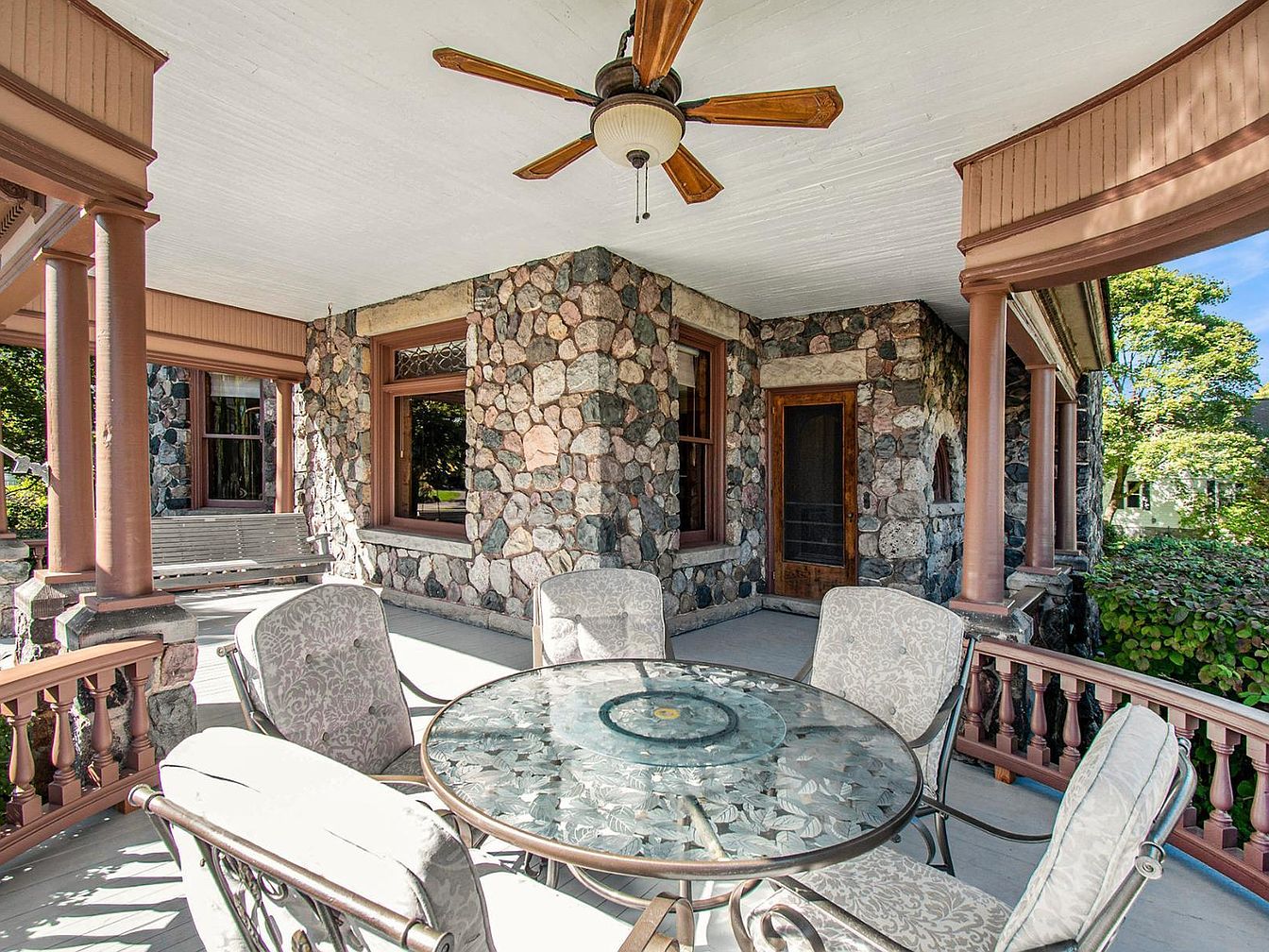 This welcoming porch merges natural stone with rich timber, creating a warm and inviting outdoor space. Decorative columns with detailed trim frame the area, while a round glass table surrounded by plush seating invites gatherings. The palette of soft grays and earthy tones complements the stone, enhancing its rustic charm. A ceiling fan ensures comfortable airflow on warm days. Large windows invite abundant natural light, and surrounding greenery provides privacy and serenity. A perfect spot for relaxation and connection with loved ones.