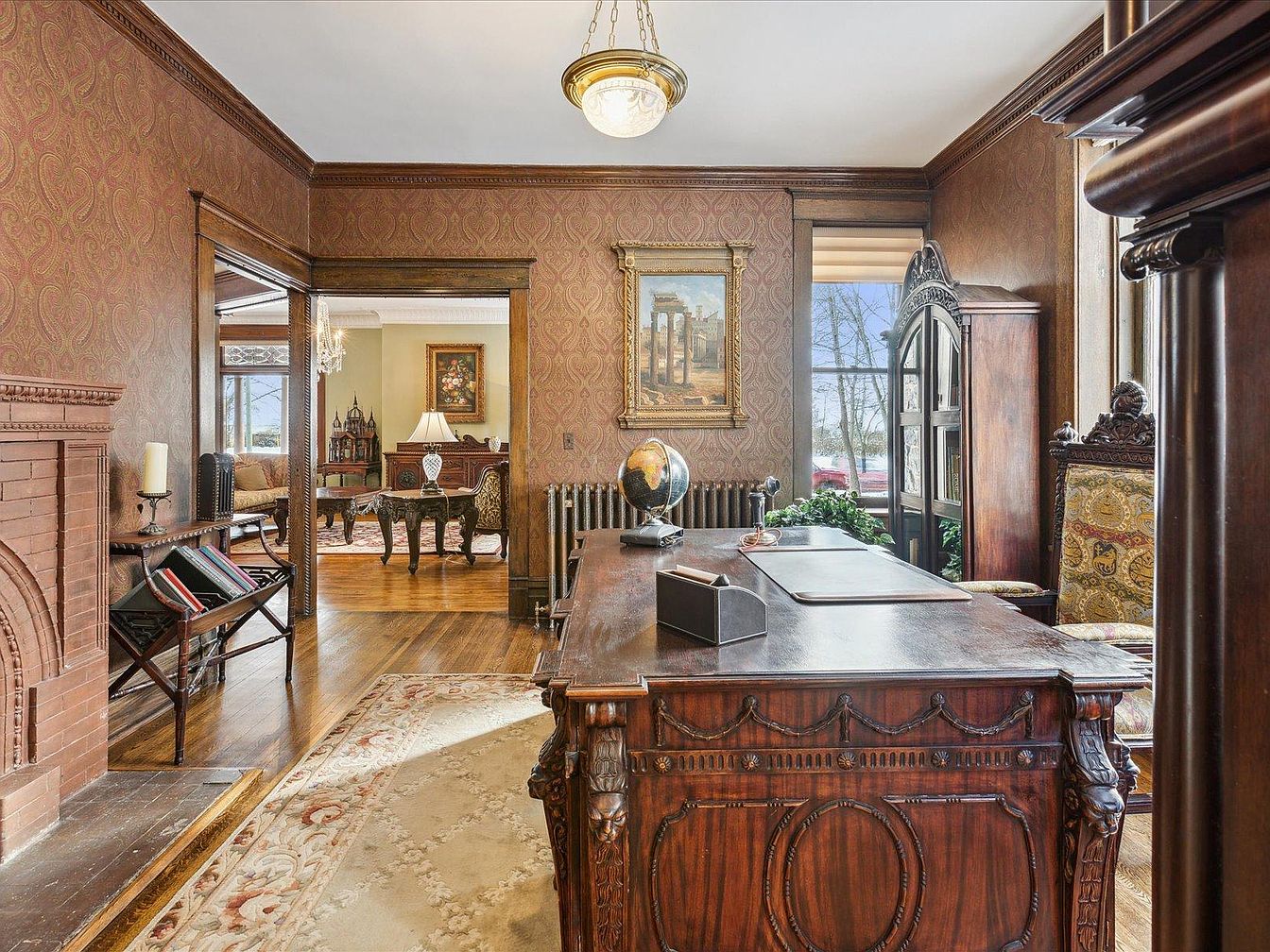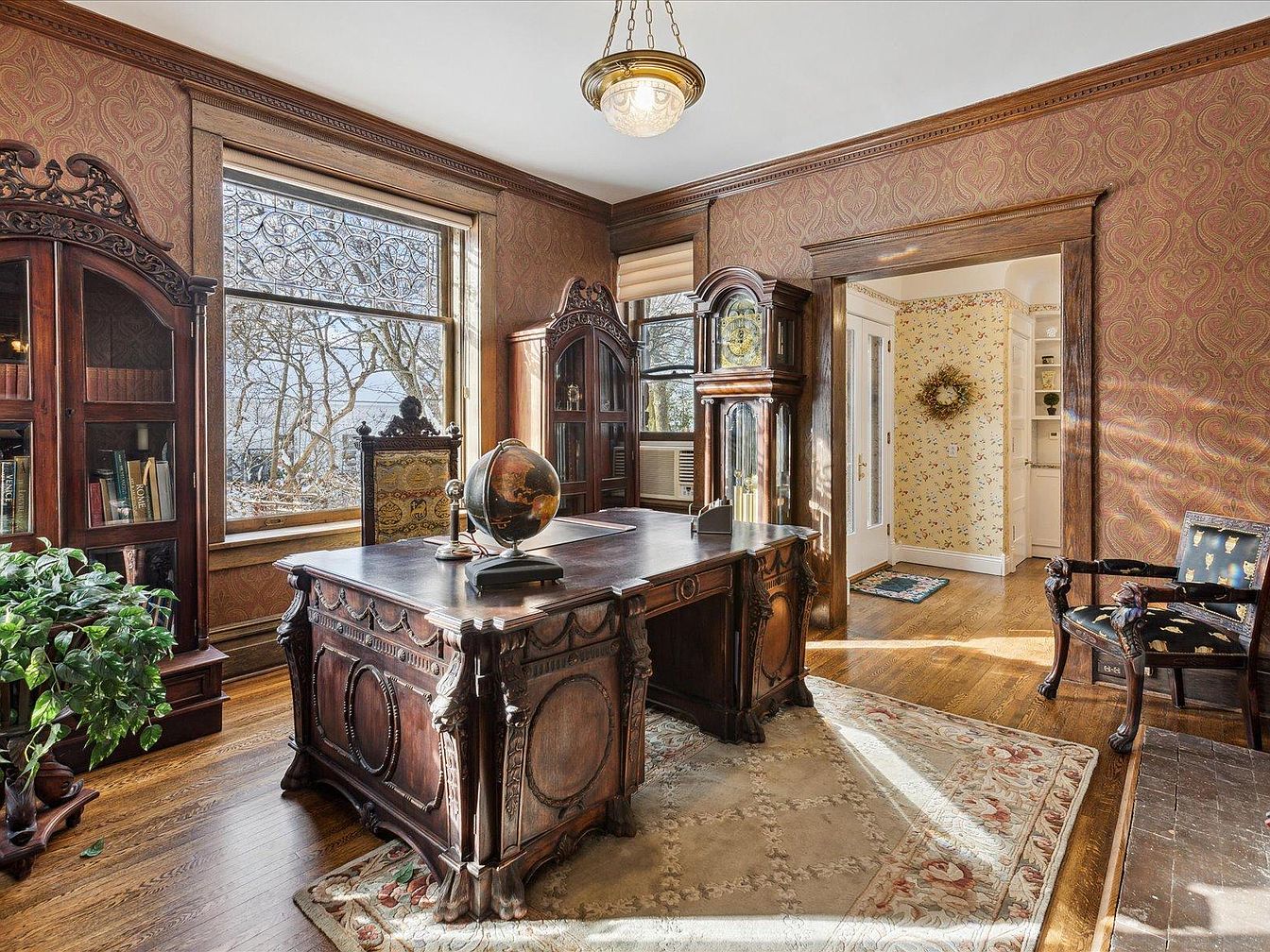 This home office showcases refined design elements, featuring ornate woodwork and warm wallpaper that create an intimate workspace. A large dark wood desk pairs with a vintage globe, while a cozy armchair offers a reading nook. The room is bathed in natural light from substantial windows, with browns and golds enhancing a welcoming atmosphere that blends practicality with timeless charm.