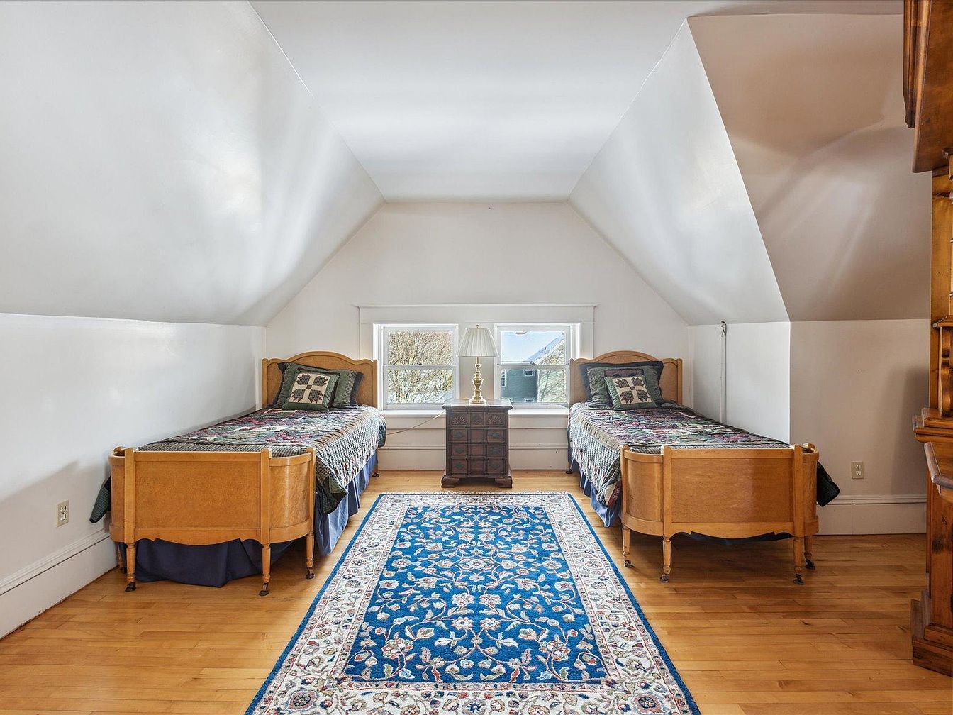 The children’s bedroom features two vintage beds dressed in colorful quilts. A blue and cream area rug anchors the space, with natural light from a large window enhancing the airy feel. Angled ceilings and warm wooden floors add character, while thoughtful furniture arrangement allows room for play and activity.