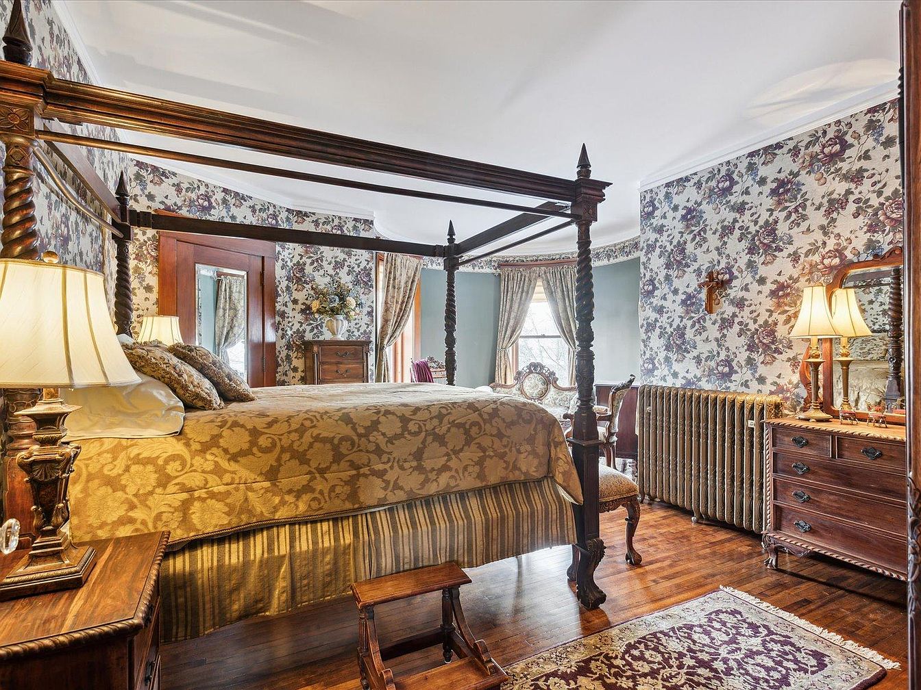 The master suite presents an ornate four-poster bed dressed in gold and lavender fabrics. Floral wallpaper complements dark wood furnishings, including a carved dresser and nightstands. A window seat and warm lighting create a cozy sanctuary. Rich floors and a patterned rug enhance the ambience, while a curved wall adds architectural interest for a serene retreat.