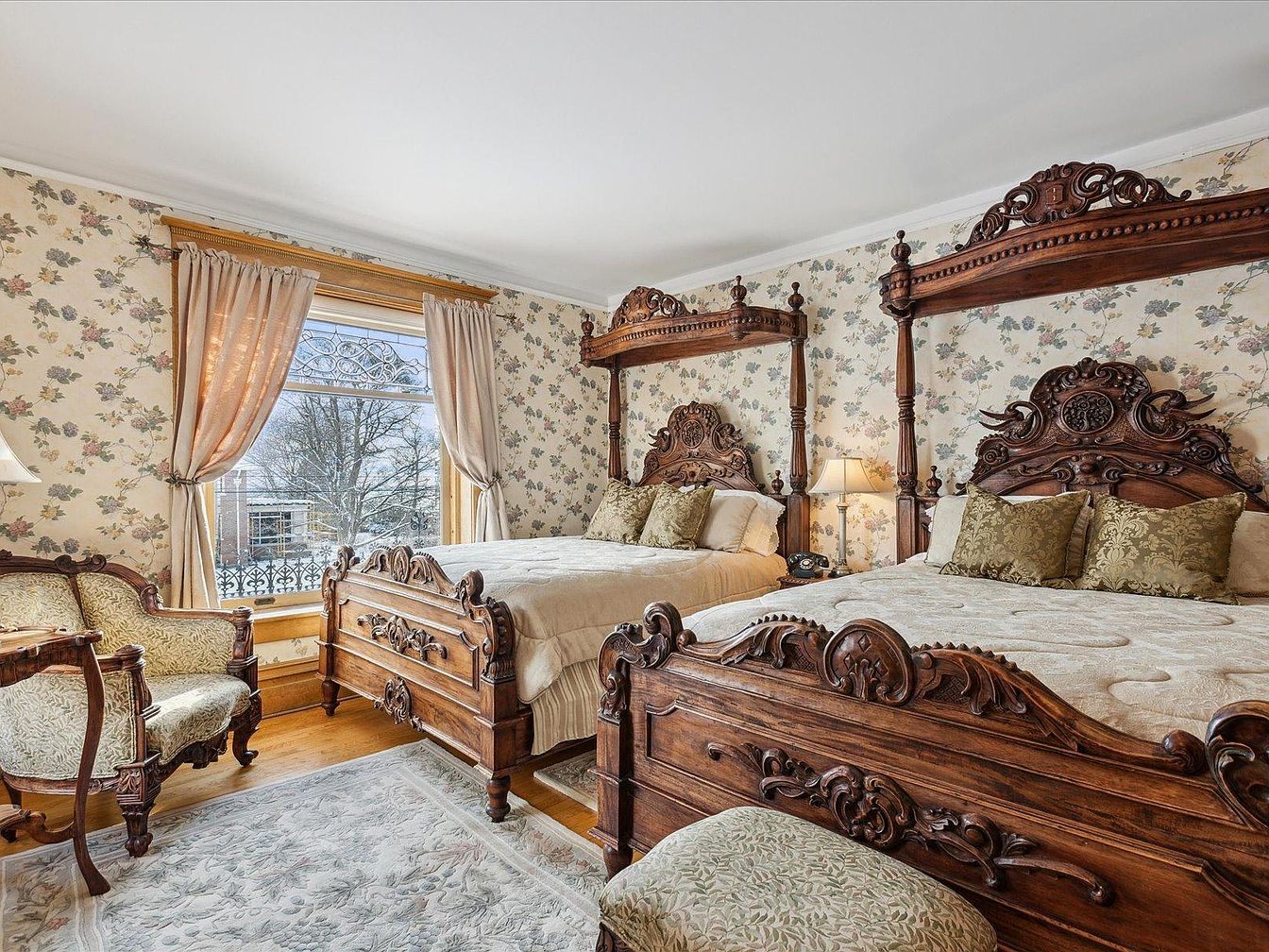 Two carved feather beds and soft pastels create a grand yet intimate guest room. Floral wallpaper, ample windows, and flowing drapery provide a bright, welcoming space. Plush bedding and a vintage chair complete the cozy atmosphere, while decorative rugs unify the space for a family-friendly feel.