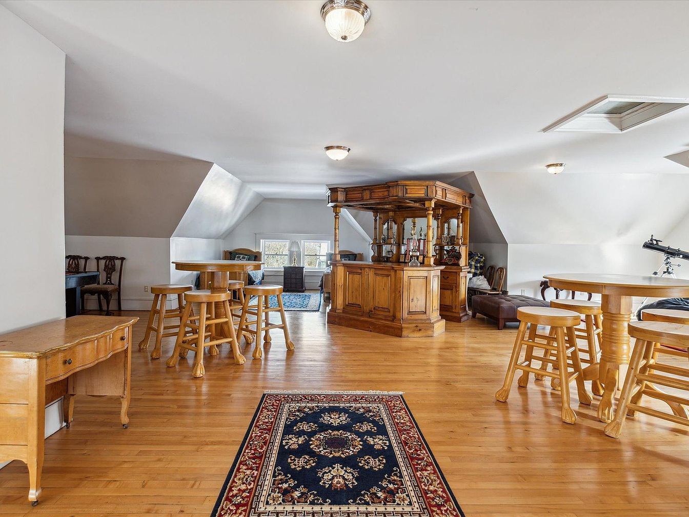 A loft area showcasing a home bar fashioned from rich wood, serving as a focal point for gatherings. Honey-toned hardwood floors and angled ceilings create a warm, intimate vibe. Light walls brighten the space, with round tables and stools for casual conversations. An area rug defines the seating area, while large windows frame scenic views, combining practicality with a welcoming aesthetic ideal for entertaining.