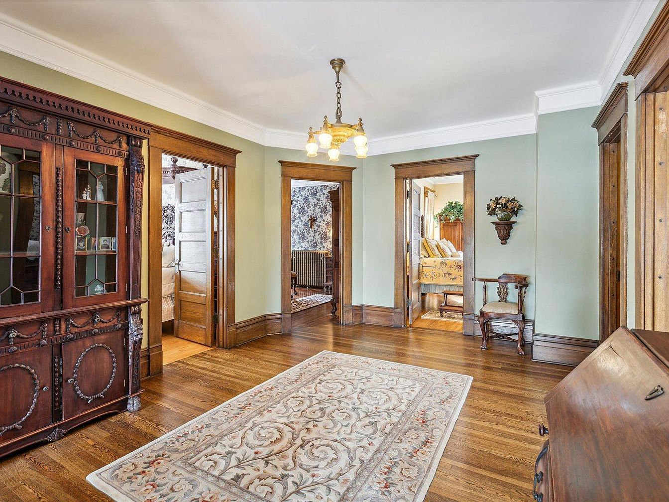 The entryway combines dark wood with detailed trim, reflecting classic American craftsmanship. Warm green walls set a comforting backdrop, while a patterned rug adds a touch of softness. An antique display cabinet and a vintage chandelier provide gentle illumination, and open doorways lead to welcoming rooms that promote a family-friendly layout.
