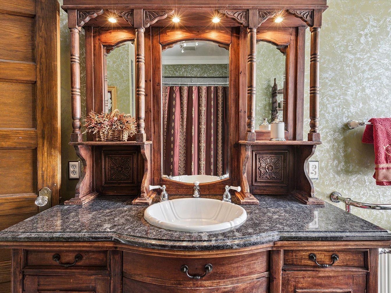 A carved wooden vanity with a dark finish defines this bathroom area. A granite countertop and ornate mirror illuminate the space, while warm-toned walls and decorative curtains introduce color. A dried flower arrangement and vintage touches contribute to the inviting, family-friendly ambiance.