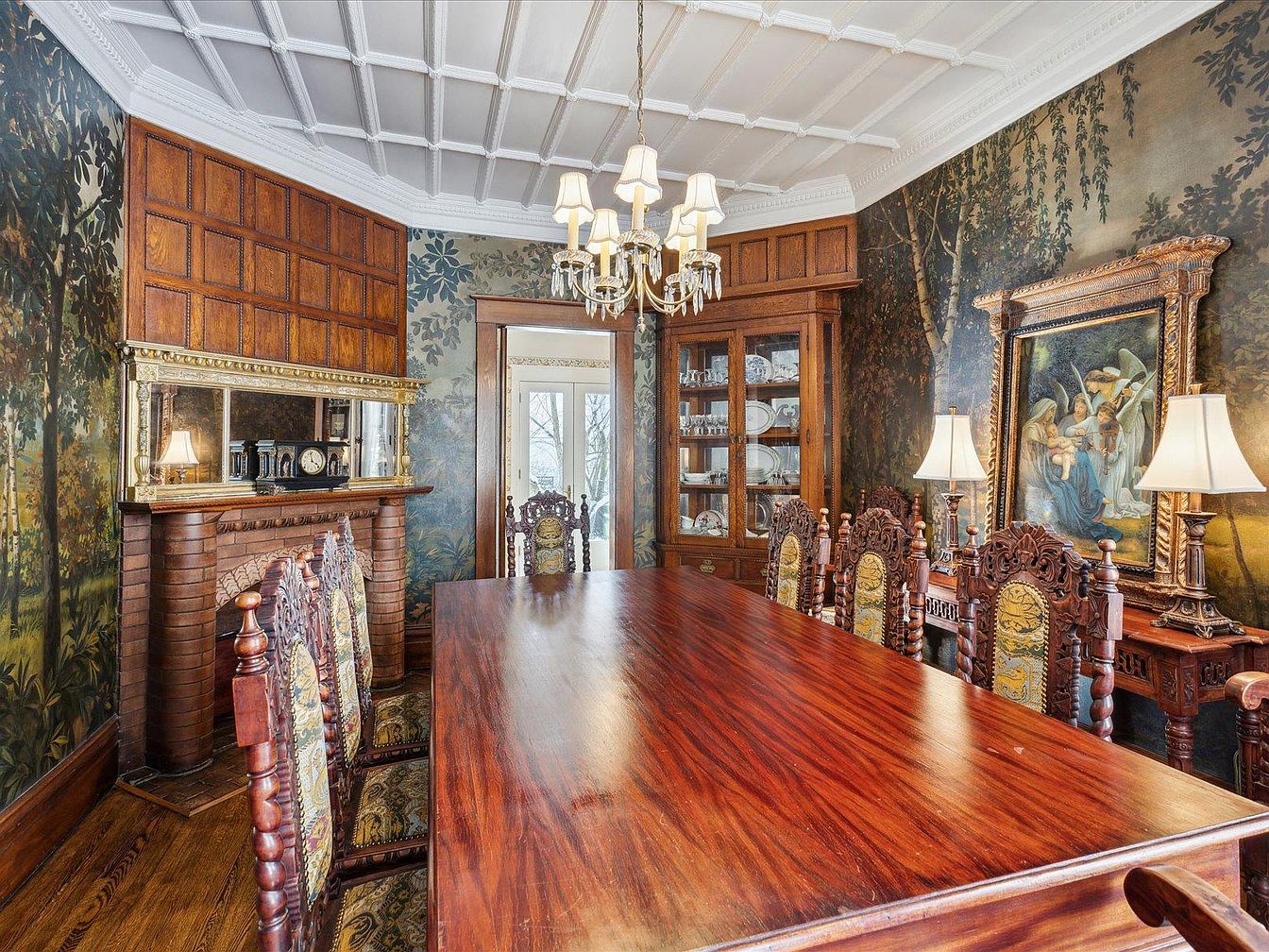 The dining room centers around a substantial wooden table with a polished surface, ideal for gatherings. Ornate high-backed chairs provide comfort and style, while walls feature vintage murals inspired by nature to elevate the welcoming ambiance. A classic chandelier hangs from a coffered ceiling, casting a warm glow. The juxtaposition of dark wood cabinetry and a fireplace against lighter tones creates a balanced, sophisticated space perfect for entertaining family and friends.