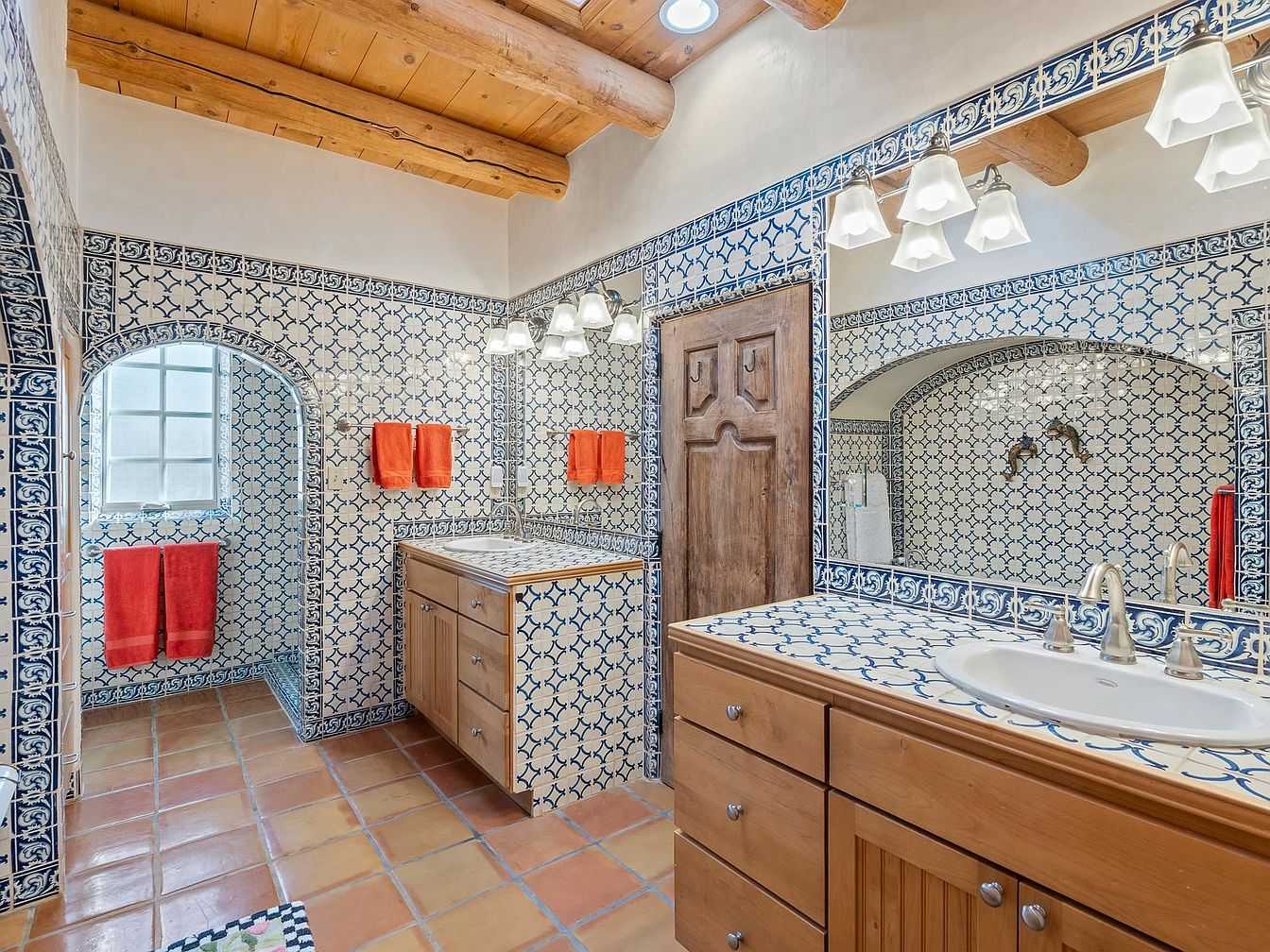 A spacious bathroom designed in a Southwestern style with rustic wooden ceiling beams and warm terracotta tile flooring. The vanity features natural wood cabinetry paired with striking blue-and-white patterned tile countertops and matching tiled walls, creating a cohesive and bright aesthetic. Large arched mirrors and generous overhead lighting provide excellent visibility and an open feeling, while a set of orange towels adds a cheerful pop of color. The double sink setup and ample counter space are practical for families, and there is plenty of storage in the cabinetry. An arched alcove accommodates additional towel bars beside a frosted window, enhancing both privacy and natural light.