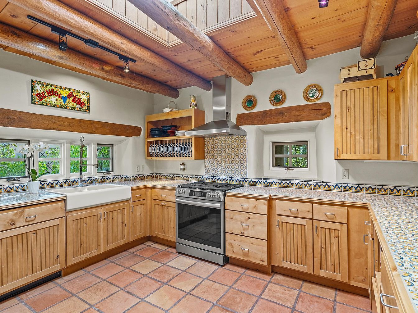 Warm and inviting, this kitchen features natural wood cabinetry and exposed log ceiling beams, enhancing its rustic charm. A tiled backsplash with intricate patterns wraps around ample counter space, ideal for family cooking. The terracotta tile floor is durable and easy to clean, perfect for active homes. Multiple windows allow for natural light, making the space bright and cheerful. A farmhouse sink by the window and a modern stainless-steel stove combine traditional style with modern convenience. Open shelving and decorative plates add a personal touch while plenty of storage helps keep the room organized and family-friendly.