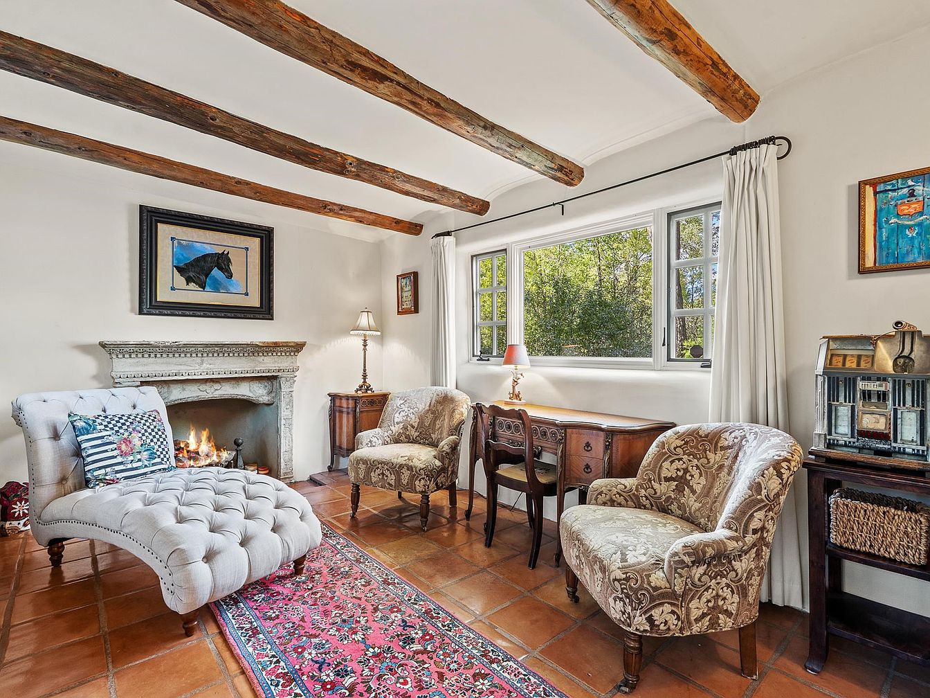 A warm, inviting living room features classic Southwestern influences with exposed wood ceiling beams and terra cotta tile flooring. An ornate stone fireplace forms the focal point, adding both character and a cozy ambiance. Large windows framed in white let in abundant natural light, enhancing the room’s brightness and offering views of lush greenery outside, perfect for family relaxation or gatherings. Comfortable, tufted chairs and a chaise lounge are arranged around a richly patterned red Persian rug, encouraging conversation. Neutral, creamy walls and elegant, carved wood furniture, including a vintage writing desk, deliver timeless charm while ensuring the space feels welcoming for all ages.