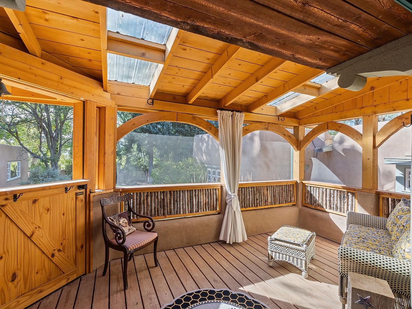 A warm and inviting enclosed patio, featuring a rustic natural wood ceiling with beams and skylights that fill the space with sunlight. The wooden accents continue with a sturdy half-door and arched supports, offering subtle Southwestern charm. Comfortable cushioned seating and a matching ottoman create a cozy corner ideal for family relaxation or quiet reading. The space is finished with decorative railings made from natural branches and a neutral, earthy color palette. A curtain can be drawn for privacy, making this patio a flexible space for both children and adults, seamlessly blending style with practical family living.