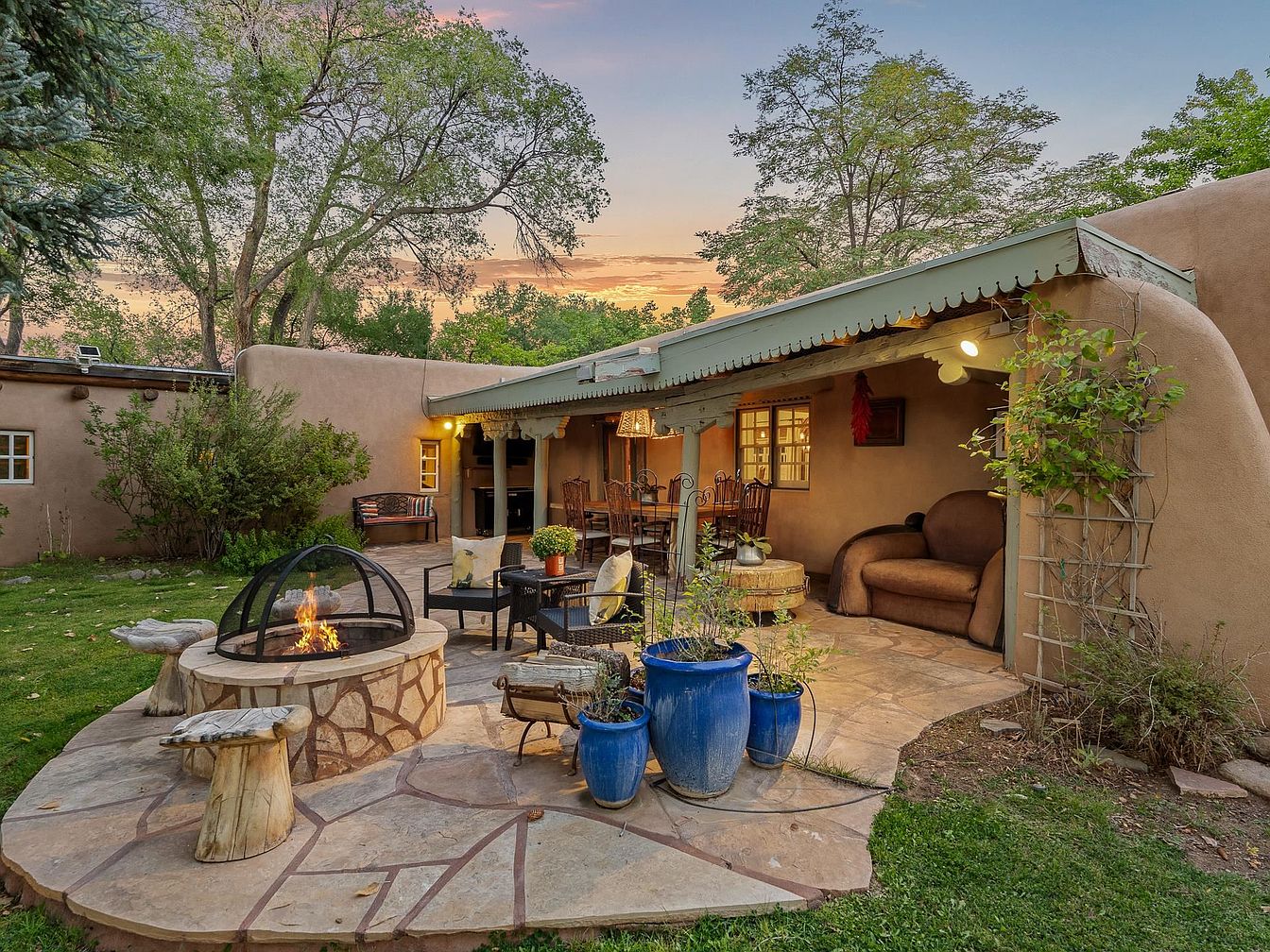 A spacious patio area designed for gatherings, featuring stone flooring that extends from the covered porch to the open firepit. The firepit, encircled by log-style stools and comfortable black outdoor chairs, offers a cozy space for family conversations on cool evenings. Potted plants in vibrant blue containers add cheerful color and life, creating a welcoming atmosphere. The adobe home’s exterior is warm beige, harmonizing with the surrounding greenery and mature trees. A cushioned brown loveseat, wooden dining table, and rustic bench provide ample seating under the covered porch, making this an inviting and practical spot for family relaxation and outdoor dining.