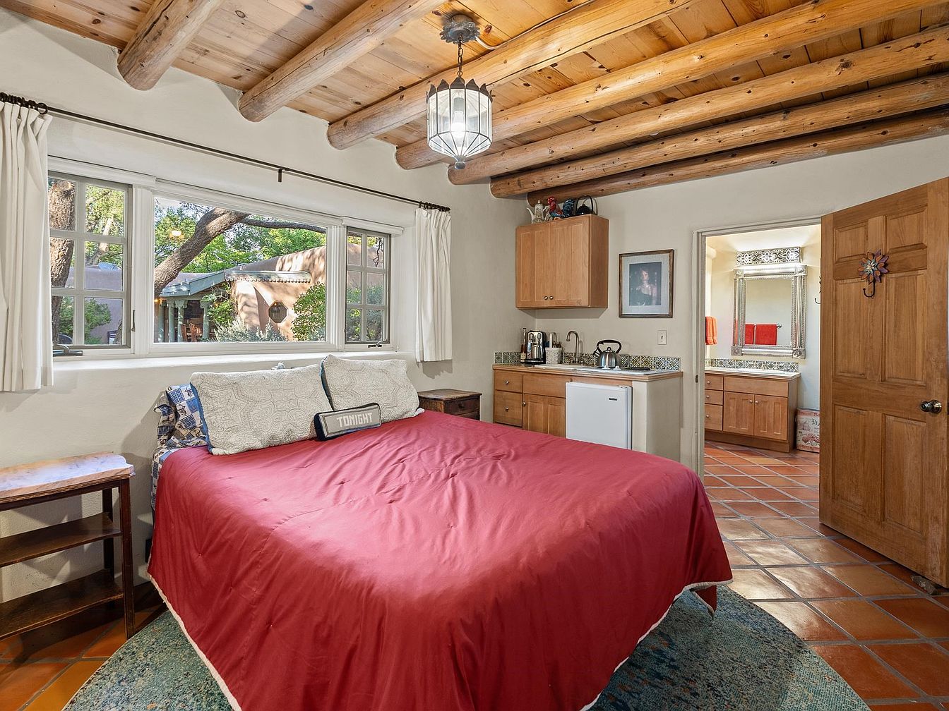 A warm, inviting bedroom features a large window above the bed allowing abundant natural light and scenic garden views, perfect for family relaxation. The space is designed with a rustic southwestern aesthetic, highlighted by exposed log beams across the ceiling and terracotta tile floors. The bed, adorned with a red duvet and decorative pillows, sits atop a textured blue area rug. Built-in wooden cabinetry provides extra storage and includes a mini fridge and coffee station, adding practical conveniences ideal for family living. The room flows seamlessly into a private bathroom, visible through an open doorway, promoting privacy and comfort for everyday use.