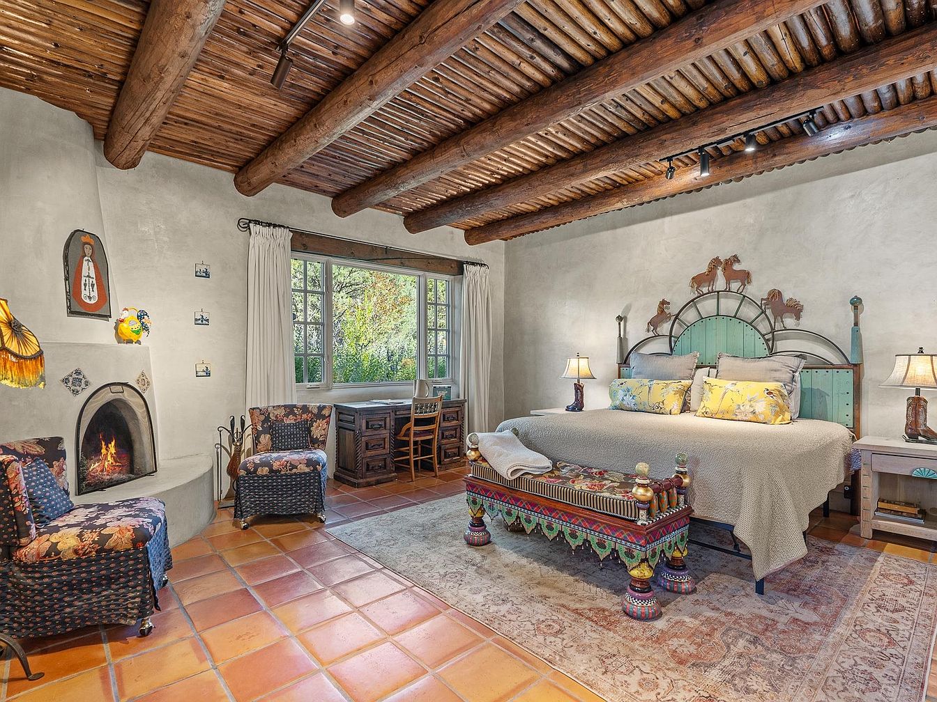 Spacious bedroom with a Southwestern style, featuring exposed wood beam ceilings and earthy plaster walls. A king-sized bed sits against one wall, crowned with a decorative metal and turquoise headboard, adding charm and character. The clay tile floor complements the room’s warm tones, and a soft area rug lies underfoot, creating a cozy environment for families. A window nook offers a sturdy wood desk and chair with a view of lush greenery, ideal for study or relaxation. The corner kiva fireplace, flanked by two floral-patterned armchairs, provides comfort and a welcoming gathering spot for all ages.