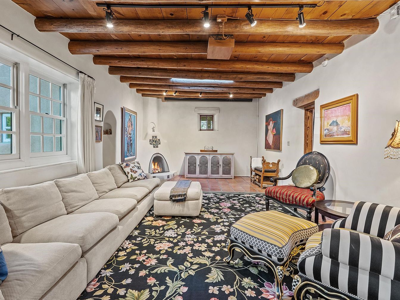 Spacious living room with rustic charm, featuring exposed wooden beams on the ceiling and soft white plaster walls. A long, plush cream-colored sectional sofa lines one side, offering ample family seating. The space is accented with a large, floral patterned area rug in dark tones, which contrasts nicely against the lighter furniture. Two artfully upholstered armchairs in black, gold, and striped fabrics add a playful touch, while a matching ottoman sits centrally. Family-friendly elements include the roomy seating and soft surfaces. Artwork, a southwestern-style fireplace, and wooden doors enhance the inviting, cozy, and culturally-rich ambiance.