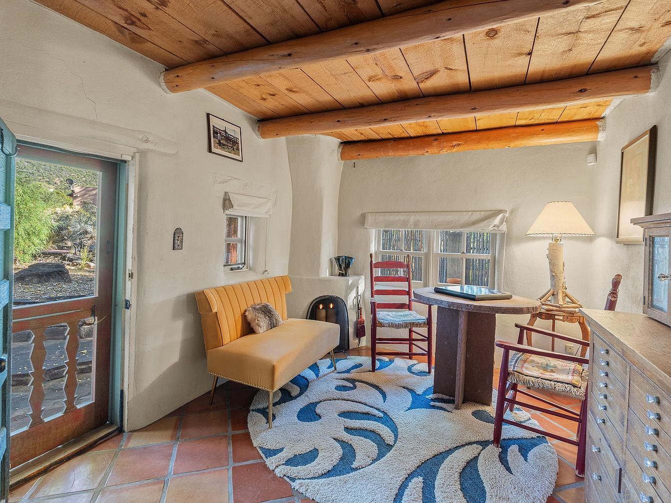 A sunlit corner room welcomes you with rustic Southwestern charm, featuring white stucco walls and a natural wood beamed ceiling. The terracotta tile flooring is partially covered by a soft, swirled area rug in cream and blue, creating a warm and family-friendly atmosphere. The room includes a cheerful mustard-yellow settee and several red and natural wood chairs arranged around a round wooden table, perfect for family gatherings or quiet activities. Large windows and a glass-paned door allow ample natural light, while a small corner fireplace adds inviting ambiance. Simple wall art and a tree-branch lamp complete the thoughtfully designed space.