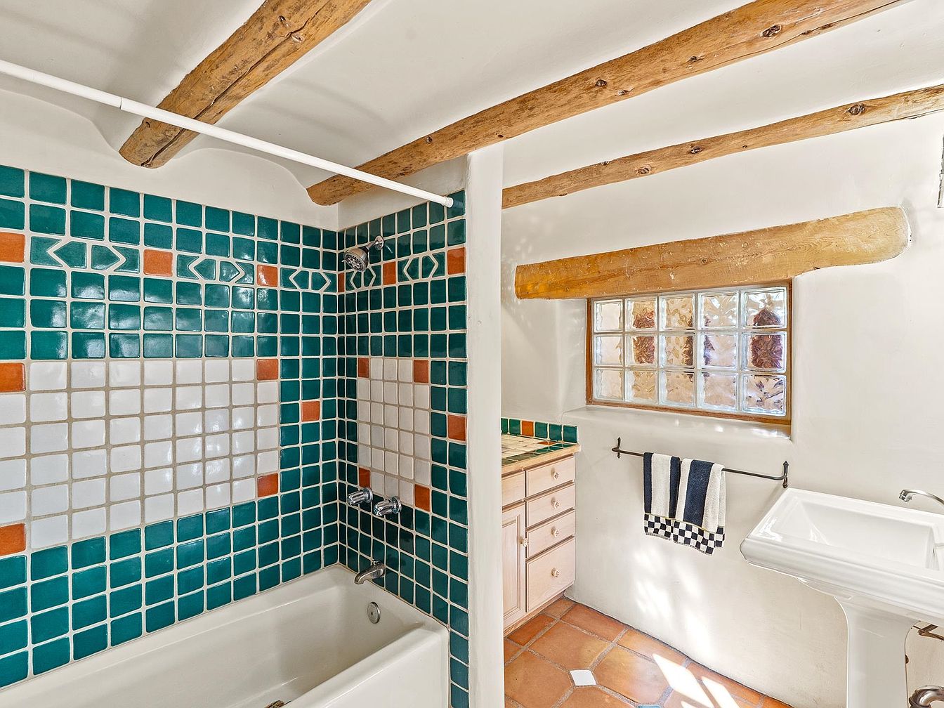 Warm and inviting bathroom featuring Southwestern design elements, perfect for families. A deep soaking tub is surrounded by glossy teal tiles, accented with white and orange patterns, adding vibrant character. The natural wooden ceiling beams and terracotta floor create a cozy, earthy atmosphere. Natural sunlight pours in through a glass block window above a beige vanity and countertop, complemented by a classic pedestal sink. Towel racks are accessible for children, and the space is open and easy to navigate. Neutral-toned cabinetry offers plenty of storage for family essentials, while the sturdy materials ensure easy cleaning and durability.