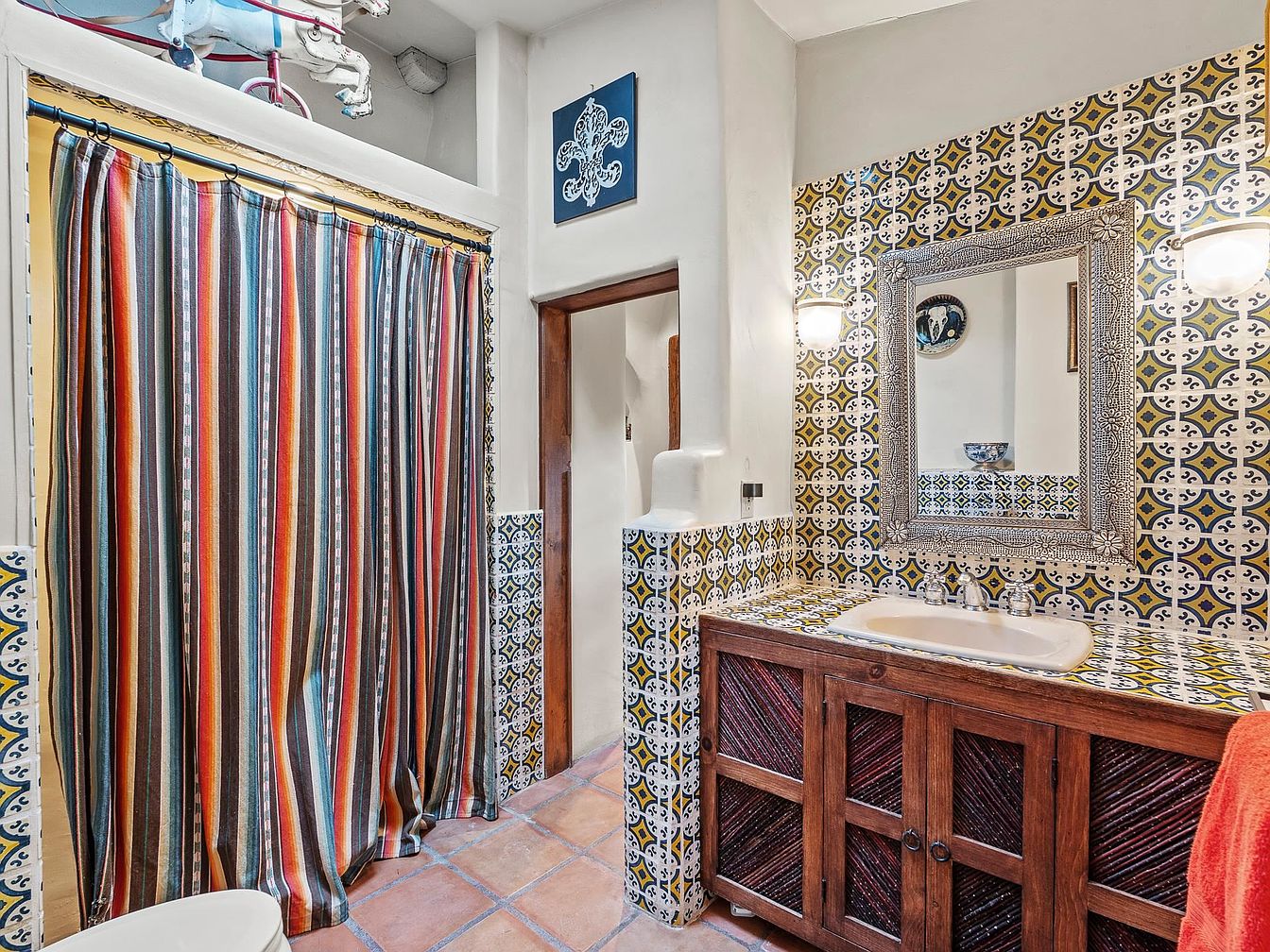A spacious bathroom featuring a striking combination of patterned tiles in blue, yellow, and white surrounding the vanity and mirror, adding a lively, artistic flair. The vanity is crafted from dark wood with textured cabinet doors, providing ample storage for a busy family. A large mirror with an ornate frame is flanked by globe sconces, offering bright, inviting lighting. The shower area is enclosed with a vibrant striped curtain, introducing more color and playfulness—a practical feature for children. The terracotta floor tiles add warmth, while a unique horse sculpture overhead adds character to this eclectic and family-friendly space.