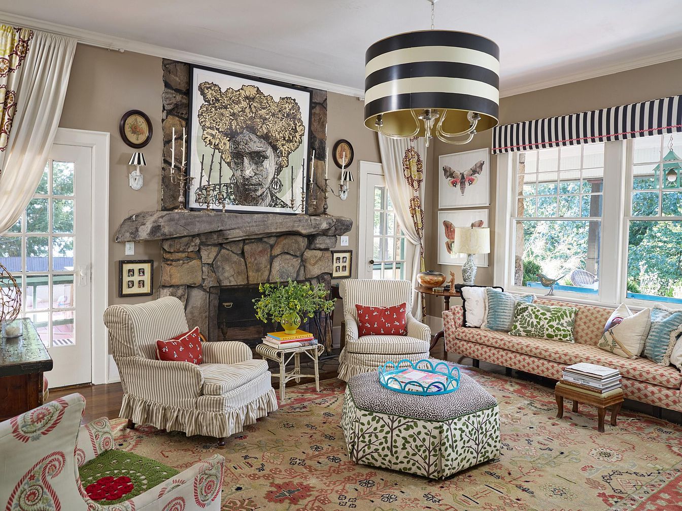 A spacious and inviting living room with abundant natural light, featuring large windows overlooking a green outdoor area. The space centers around a rustic stone fireplace, adorned with a striking portrait above the mantel and flanked by candelabras. Comfortable, patterned armchairs and a long, plush sofa form a cozy conversation area, with soft, layered pillows providing family-friendly comfort. The colorful, patterned ottoman offers versatile seating or a spot for board games. Warm, neutral wall paint contrasts with cheerful textiles, whimsical art, and playful striped decor. Durable hardwood floors and a vibrant area rug add warmth, making the room perfect for relaxing and gatherings.