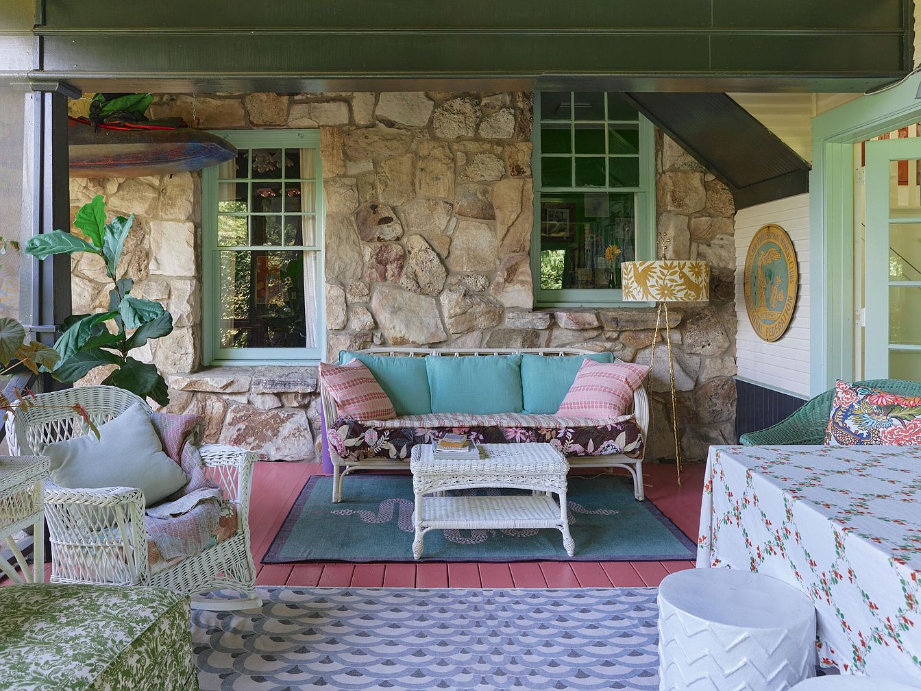 Cozy and inviting, this stone patio features a blend of rustic and playful elements perfect for family gatherings. The walls are made of rough-cut tan stone, giving the space a cottage-like appeal. Comfortable wicker armchairs and a loveseat with pastel cushions and eclectic patterned pillows create a welcoming seating area. A white wicker coffee table adds functionality, ideal for drinks and snacks. The painted mint-green window frames and door trim add a refreshing touch, while a large leafy plant brings in greenery. Layered rugs with geometric and serpent patterns combined with a floral-covered table emphasize a lively, family-oriented atmosphere.