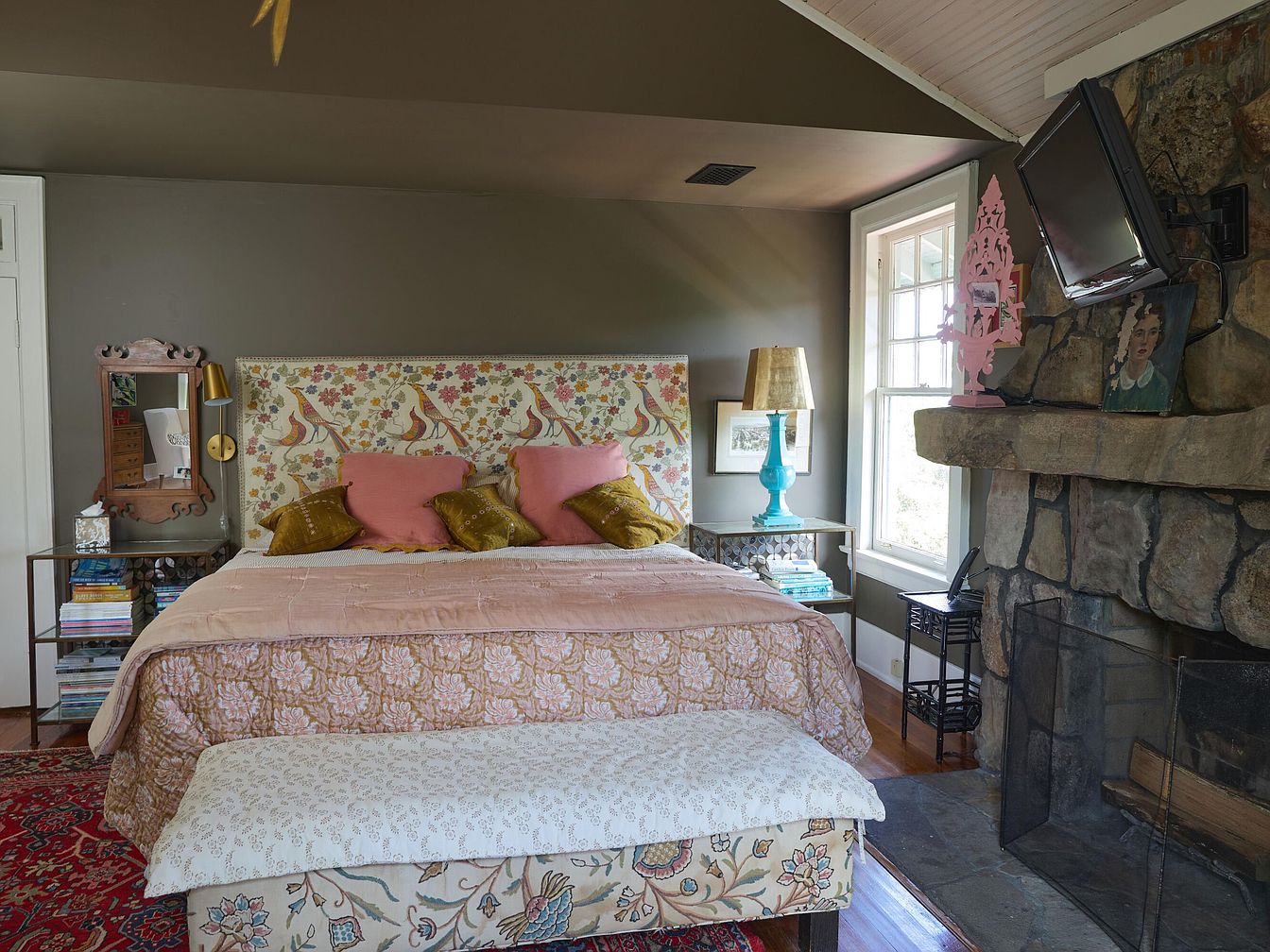 A cozy bedroom featuring a large bed with a patterned headboard and soft, pastel bedding, accented by pink and gold throw pillows for a warm, inviting touch. The room is bathed in natural light from a nearby window and features a striking stone fireplace adding rustic charm and warmth, ideal for family relaxation. Colorful area rugs and elegant wall paint in taupe and taupe-brown tones create a soothing atmosphere. There are thoughtfully placed bedside tables holding books and lamps, maximizing functionality. The space exudes comfort and personality, perfect for family living with ample room, comfortable textures, and visually appealing details.