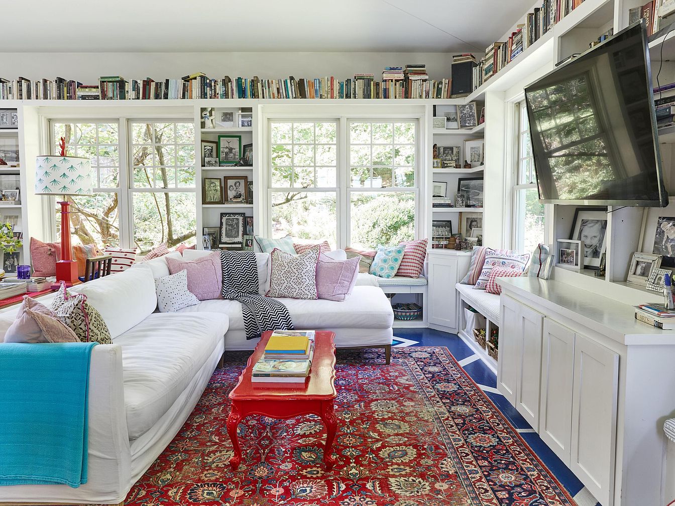 A bright, welcoming living room with large corner windows framed by white built-in bookcases filled with books, family photos, and décor items. A spacious white sectional sofa, adorned with an array of pastel and patterned throw pillows, wraps around a vibrant red coffee table on top of a richly patterned red rug. The room includes cozy bench seating under the windows, perfect for reading or relaxing. A flat-screen TV is mounted above the white cabinetry, which offers hidden storage for games and toys. The colorful and eclectic design makes this a warm, family-friendly space for relaxing or gathering together.