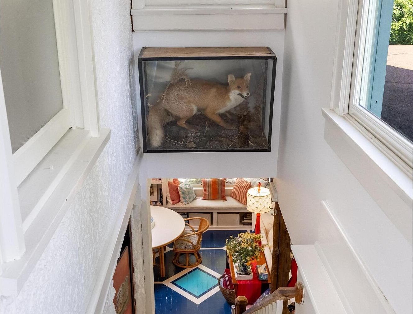 A bright stairway landing featuring a unique decorative element—a glass display case mounted at mid-level, showcasing a taxidermy fox. The walls are painted crisp white, adding to the airy atmosphere, and multiple windows let in ample natural light. At the foot of the stairs, a cozy and colorful family room is visible, with a round white dining table, rattan chairs, and a built-in bench adorned with patterned throw pillows. A blue painted floor with white geometric accents leads to an inviting sitting area furnished with a whimsical lampshade and a table filled with flowers, perfect for family gatherings and relaxation.