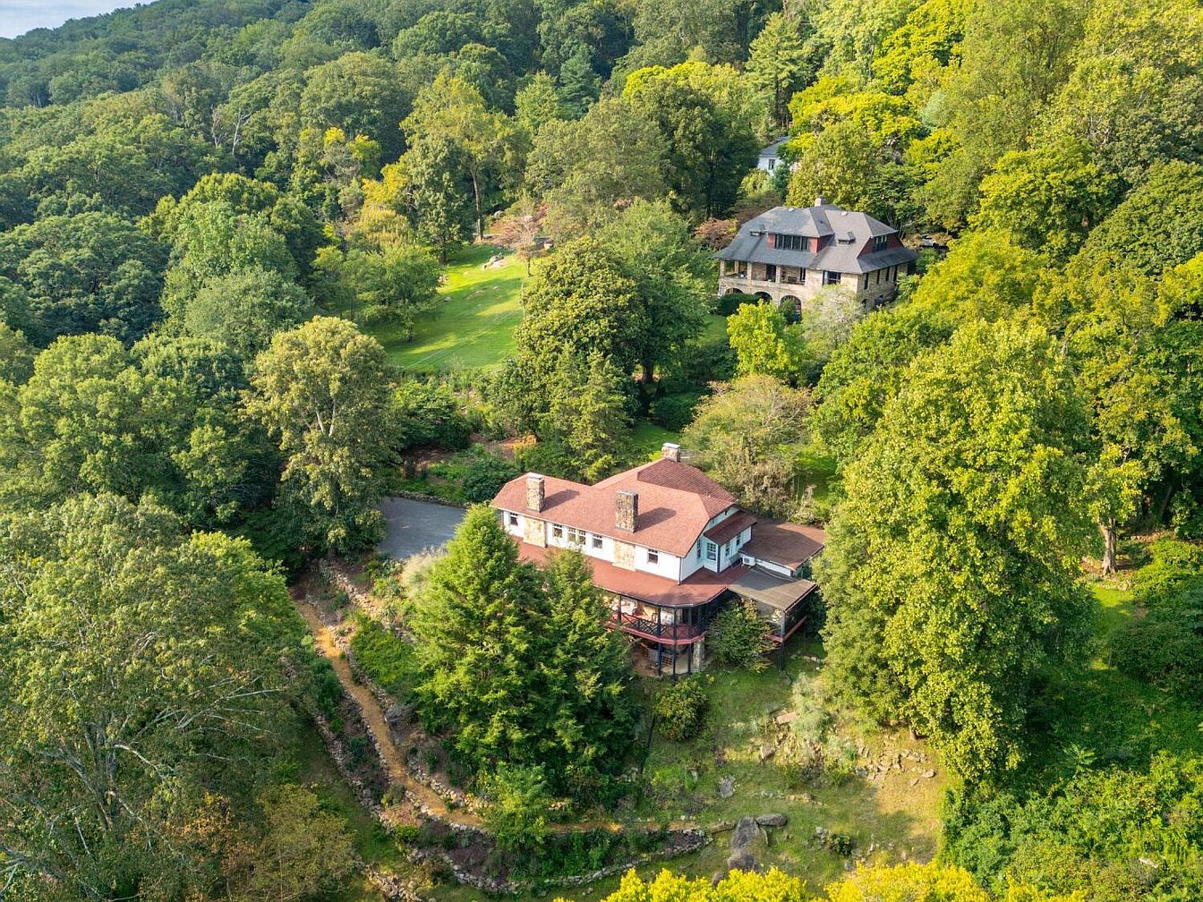 Nestled among lush, mature trees, this American home offers a peaceful, green oasis perfect for families. The aerial view highlights the winding driveway leading to the house, surrounded by abundant foliage, with a large expanse of landscaped lawn ideal for children to play or family gatherings. The home’s striking red roof stands out against the green backdrop, complemented by white exterior walls and a wraparound porch, perfect for enjoying quiet evenings outdoors. Stone-lined pathways meander through the grounds, blending rustic natural elements with curated landscaping that encourages exploration and outdoor fun for all ages.