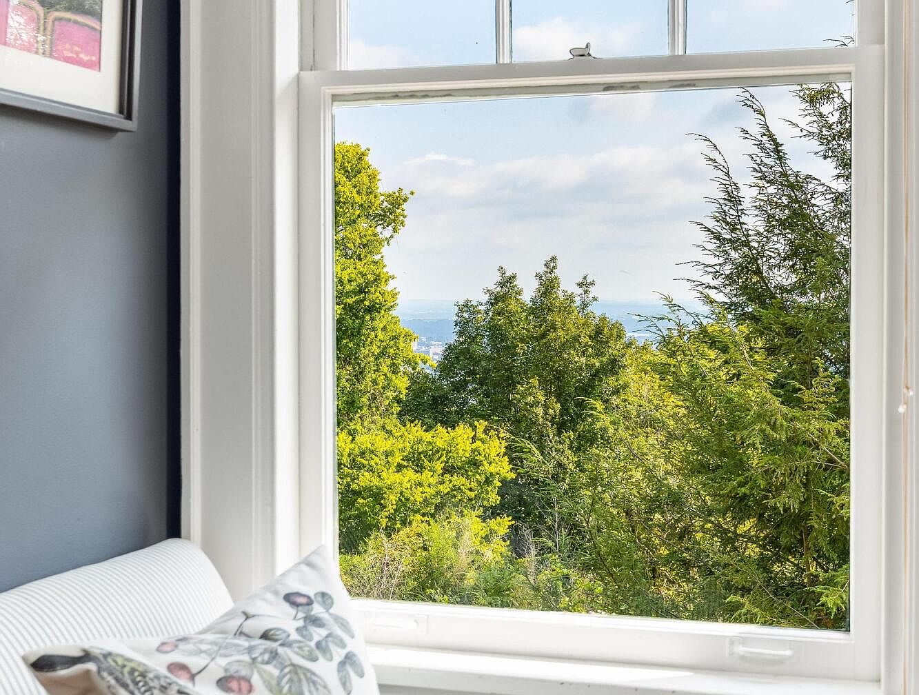Bright and inviting window nook features a large white-trimmed sash window offering expansive views of lush green trees and blue sky beyond. The nook includes a comfortable, pale striped cushion with botanical-themed throw pillows, making it an ideal spot for family reading or relaxation. The surrounding walls are painted a calming slate blue, accented by crisp white trim and a piece of modern wall art, creating a cozy yet fresh ambiance. This serene corner is perfect for children or adults alike, allowing natural light to flood the space while enjoying connection to the outdoors from the safety and comfort of the home.