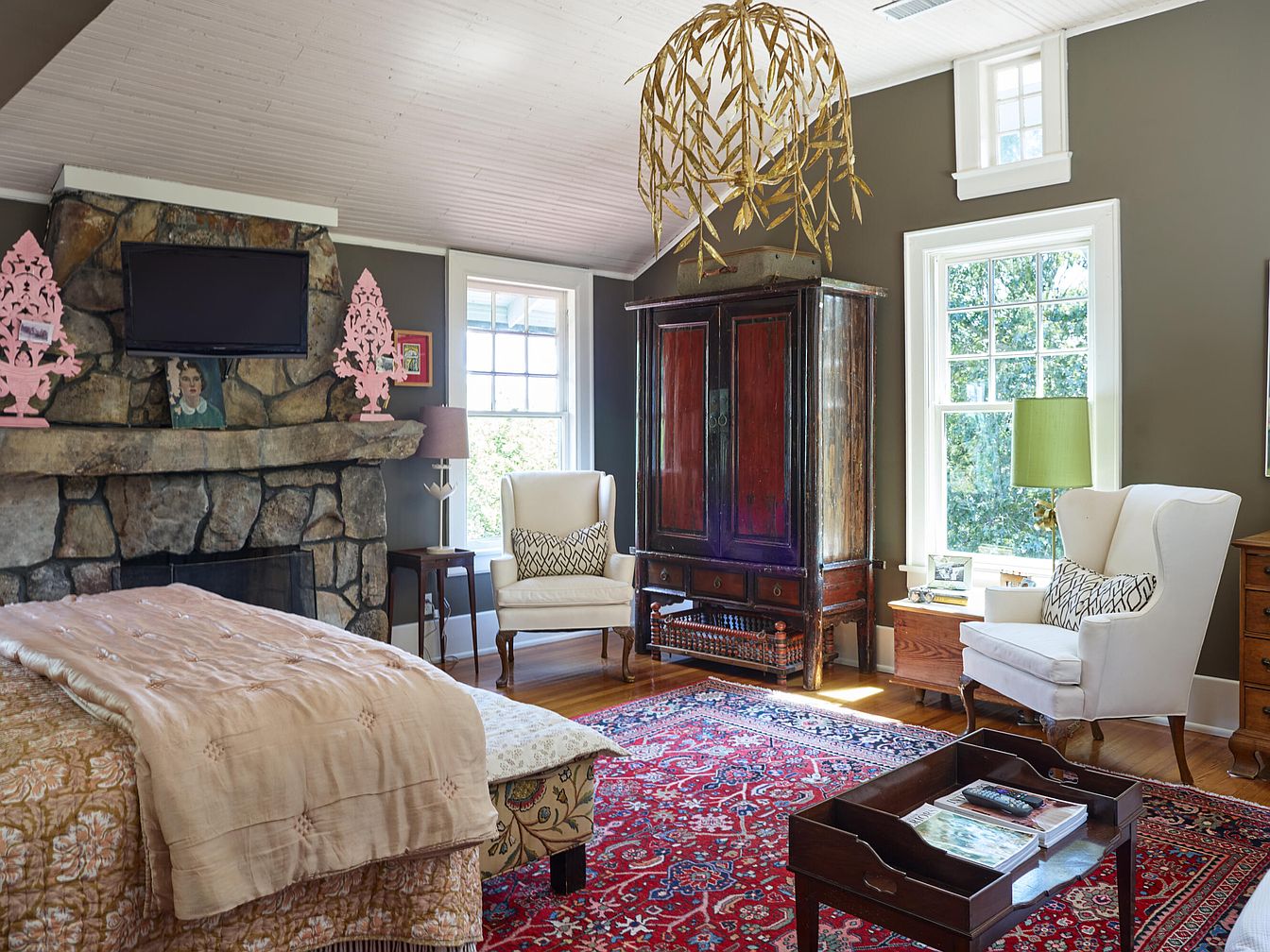 This inviting bedroom corner is thoughtfully designed for relaxation and family comfort. A pair of cream-colored wingback chairs flank a window, offering a cozy spot for reading or unwinding together. The room features a striking stone fireplace with a mounted television above and playful pink decorative pieces, making it both stylish and suitable for kids. A large oriental rug in vibrant reds covers warm hardwood floors, tying the space together. The color palette blends earthy browns with soft ivory, while natural light streams through oversized windows. Decorative touches, ample seating, and open floor space create an ideal setting for family life.