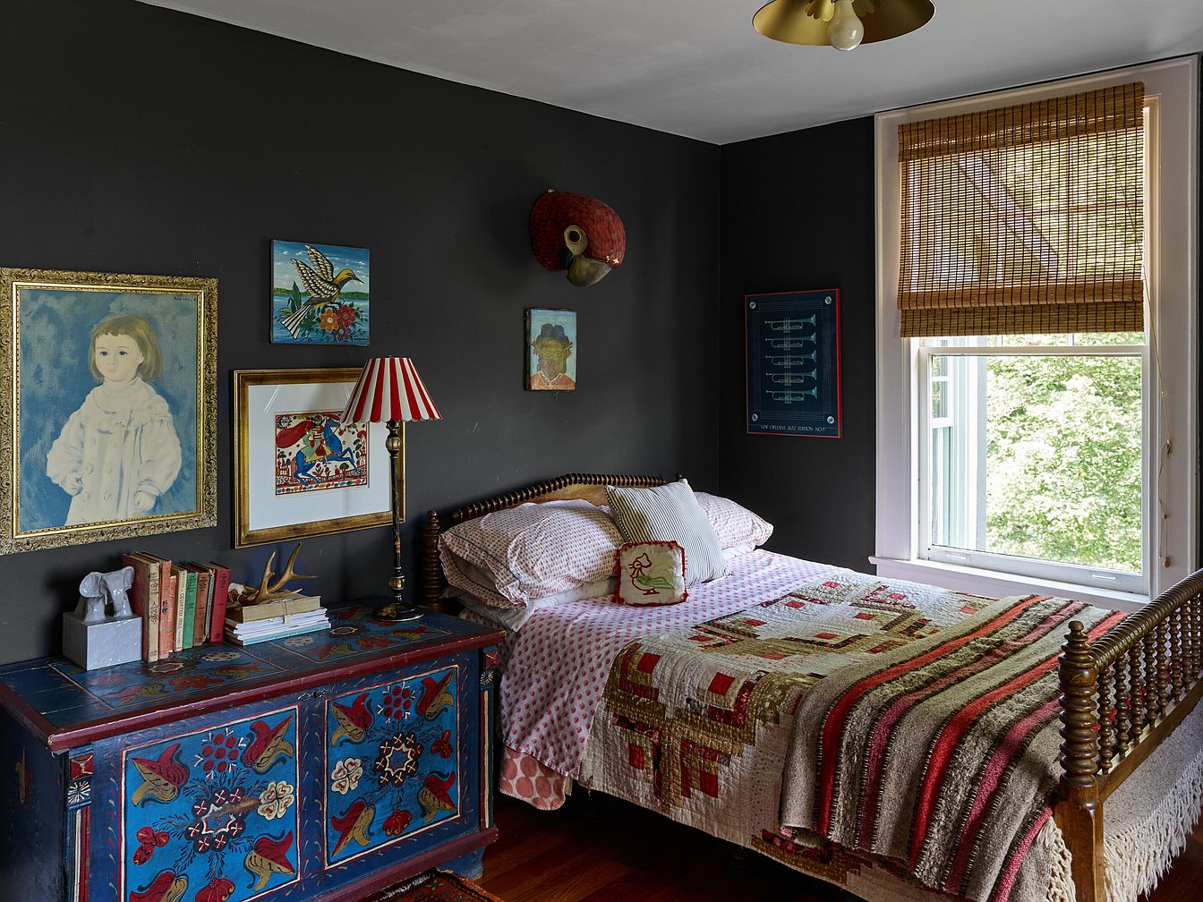 This cozy children’s bedroom features a spindle wood bed with a quilted blanket in warm red, cream, and brown tones. The walls are painted a deep charcoal, lending a modern but homey feel, and display an eclectic collection of framed art—including a child’s portrait and playful creative pieces. A blue folk-style chest with colorful painted flowers sits against the wall, offering ample storage for books and toys. A striped red and white lampshade adds a pop of color atop the chest. The large window with woven bamboo blinds lets in natural light and offers a view of greenery outside, making the space bright and inviting for a family.