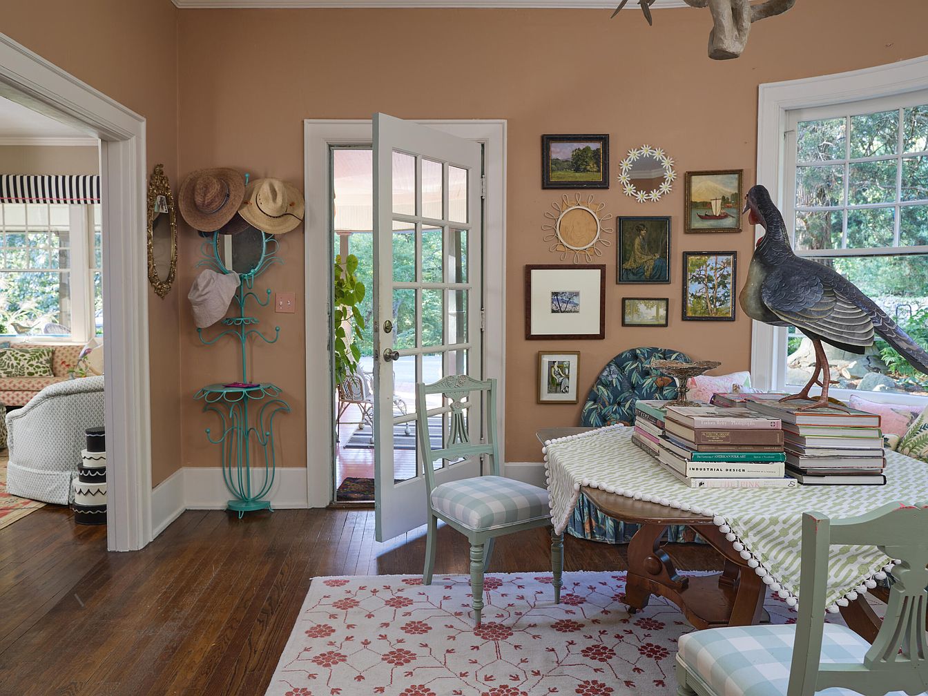 A charming dining nook features a round wooden table draped with a patterned cloth, surrounded by pastel green chairs with checked upholstery. On the table sits a whimsical bird sculpture and a neat stack of books, adding a playful touch. Large windows let in plenty of natural light and provide a view of greenery outside, perfect for family gatherings. The walls are painted warm beige and adorned with an eclectic collection of framed art and mirrors. A light blue metal coat rack holds a few hats, while a floral rug beneath the table brings a cozy, inviting atmosphere suitable for any family.