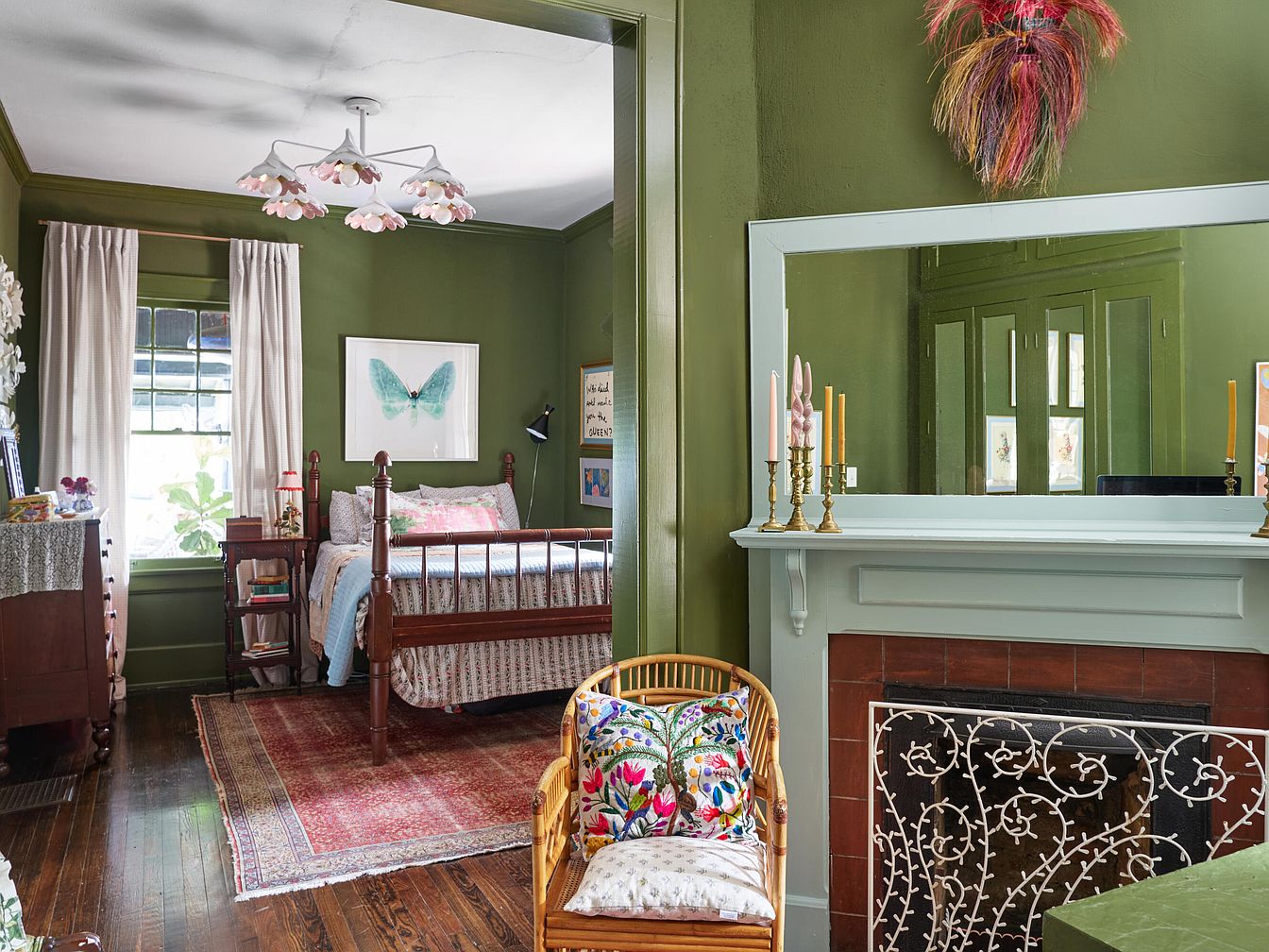 A cozy family-oriented bedroom is seen with olive green walls, imparting a warm and inviting atmosphere. The space features a vintage wooden bed dressed in patterned bedding, perfectly complemented by a colorful area rug on polished hardwood floors. Cream drapes frame large windows, filling the room with natural light. The classic white mantelpiece with gold candlesticks and a decorative mirror adds elegance beside the ornate fireplace, protected by a delicate metal screen. A rattan chair with vibrant floral cushions offers a cheerful seating nook, and tasteful wall art lends a personal, creative touch. The room feels safe, comfortable, and ideal for children.