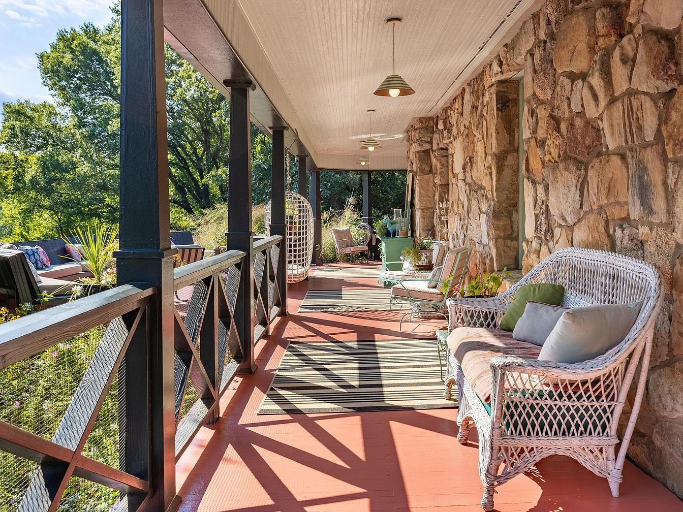 Spacious front porch with charming stone walls and welcoming wicker furniture, including a cozy loveseat adorned with plush green and gray pillows. Sturdy black columns and rustic wood railings frame the space, while striped rugs add warmth underfoot. Overhead pendant lights provide gentle illumination, and a hanging chair at the end invites relaxation. The porch overlooks lush greenery, making it an ideal spot for family gatherings, safe play, or quiet evenings. The earthy tones of the stone, soft green decor, and natural textures blend seamlessly, creating a serene and inviting atmosphere perfect for unwinding or entertaining outdoors.