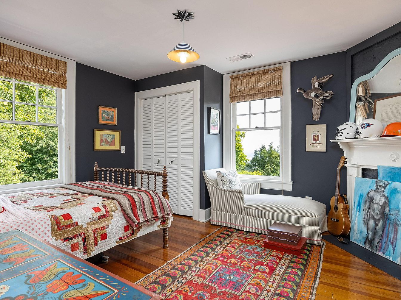 Spacious, sunlit bedroom featuring large windows with views of lush greenery, perfect for a family seeking a cozy yet airy resting space. The room displays a harmonious mix of rich wood flooring and deep blue-gray walls, softened by white trim and a pale ceiling. A vintage spindle bed is adorned with colorful patchwork quilts for a welcoming, homey vibe. Family-friendly design includes ample natural light, comfortable seating by the window, and playful decorative accents like a wall-mounted bird sculpture and sports helmets. Layered with woven blinds, folk art, a vibrant area rug, and personal touches, the space feels inviting and personalized for all ages.