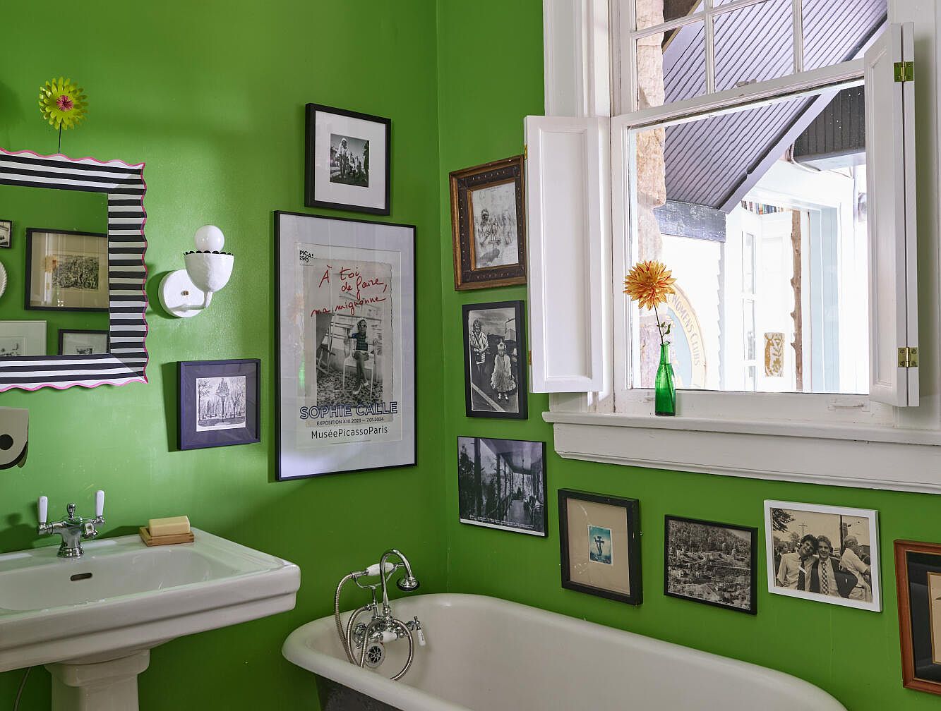 This bright and cheerful bathroom features vibrant green walls that bring energy to the space, making it an inviting spot for families. A classic white clawfoot tub sits beneath a large window framed with white trim, which lets in ample natural light. Wall art, including black-and-white family photos and playful prints, adds a personal touch and makes the room feel warm and lived-in. A white pedestal sink is paired with chrome fixtures, and above it hangs a whimsical striped mirror. The open window, displaying a single yellow flower in a green bottle, contributes to both ventilation and a fresh, homely atmosphere.