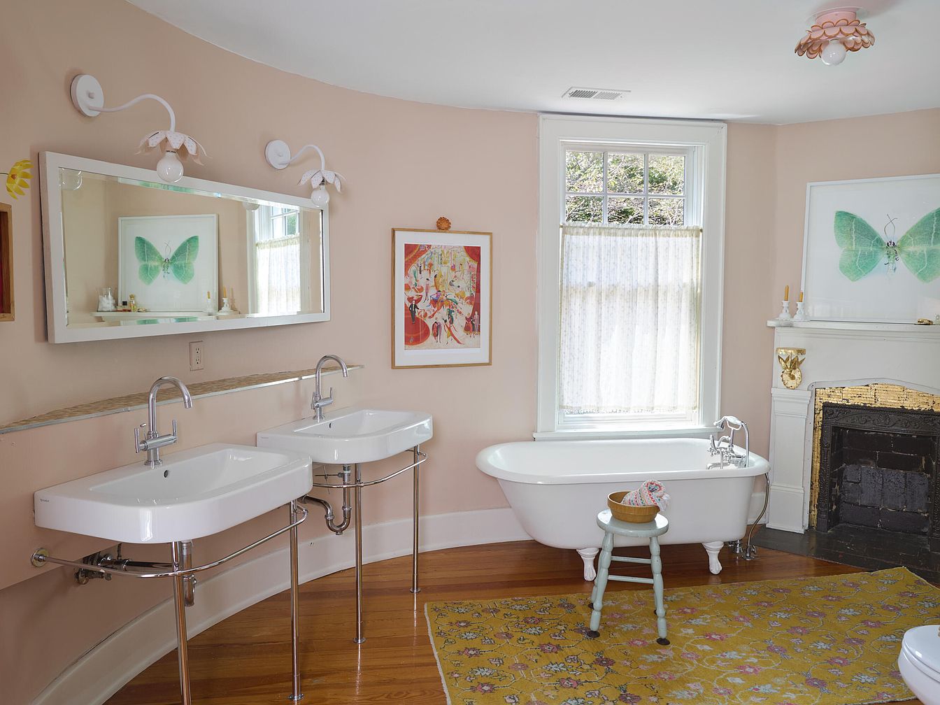 Soft pastel pink walls create a soothing backdrop in this spacious family bathroom, accented by honey-toned wooden floors and a patterned yellow area rug for warmth. Double wall-mounted white sinks with sleek chrome fixtures are set beneath a wide mirror and delicate flower-shaped light sconces, promoting ease of use for family members. The classic clawfoot bathtub is positioned by a large window draped with sheer curtains, allowing natural light while maintaining privacy. Decorative touches include playful butterfly art, a whimsical small stool, and a vintage fireplace mantel, making the space both inviting and practical for daily routines and bath time with children.